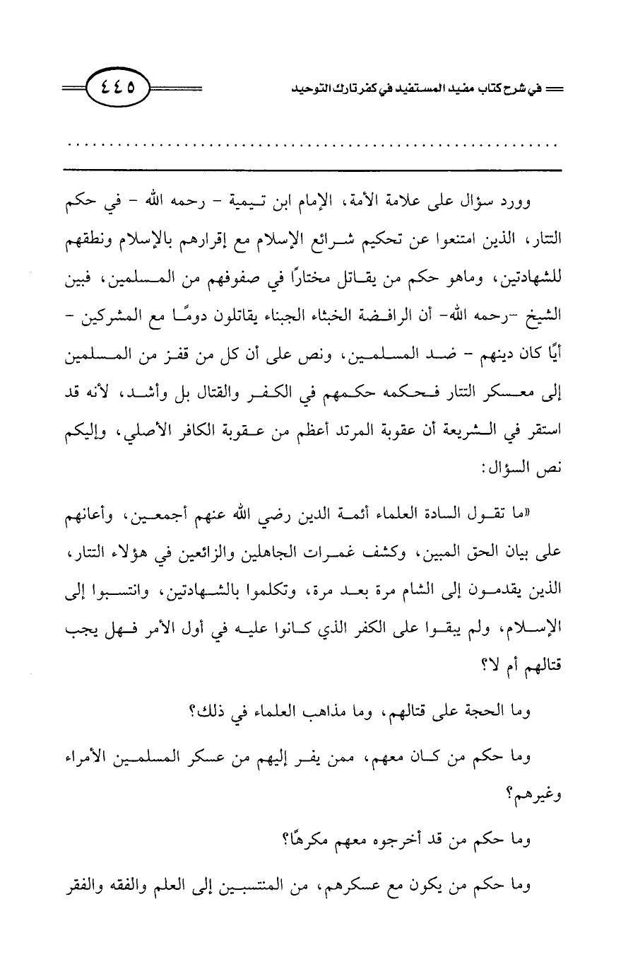 «ما تقول السادة العلماء أئمة الدين رضي الله عنهم أجمعين، وأعانهم على بيان الحق المبين، وكشف غمرات الجاهلين والزائغين في هؤلاء التتار، الذين يقدمون إلى الشام مرة بعد مرة، وتكلموا بالشهادتين، وانتسبوا إلى الإسلام، ولم يبقوا على الكفر الذي كانوا عليه في أول الأمر فهل يجب قتالهم أم لا؟
