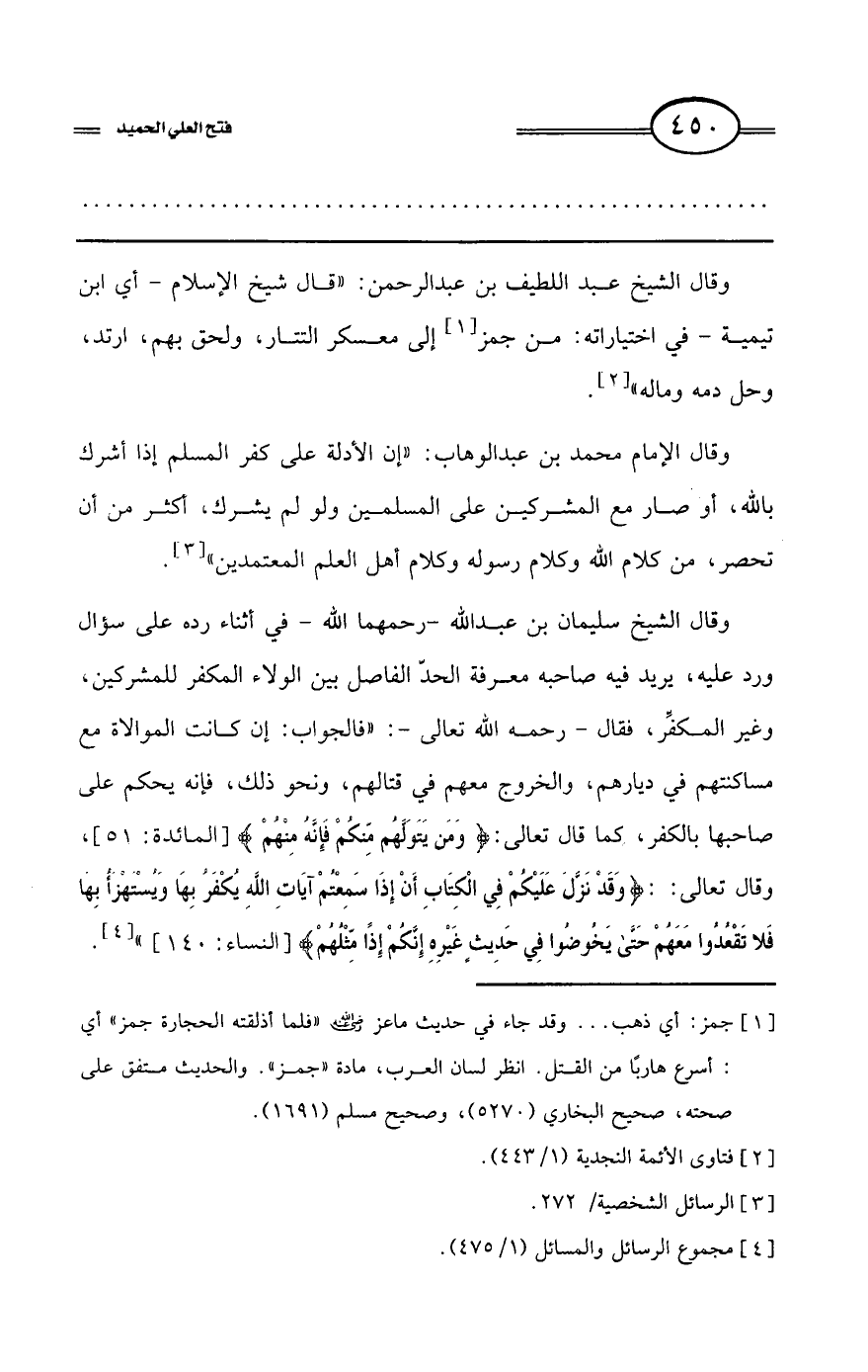كتاب فتح العلي الحميد في شرح كتاب مفيد المستفيد في كفر تارك التوحيد