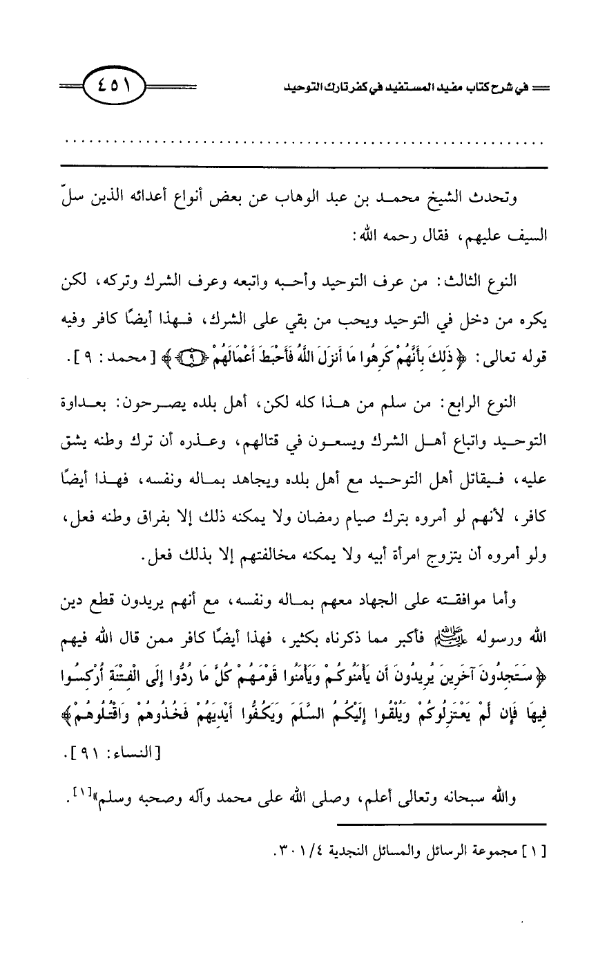 وتحدث الشيخ محمد بن عبد الوهاب عن بعض أنواع أعدائه الذين سل السيف عليهم، فقال رحمه الله: