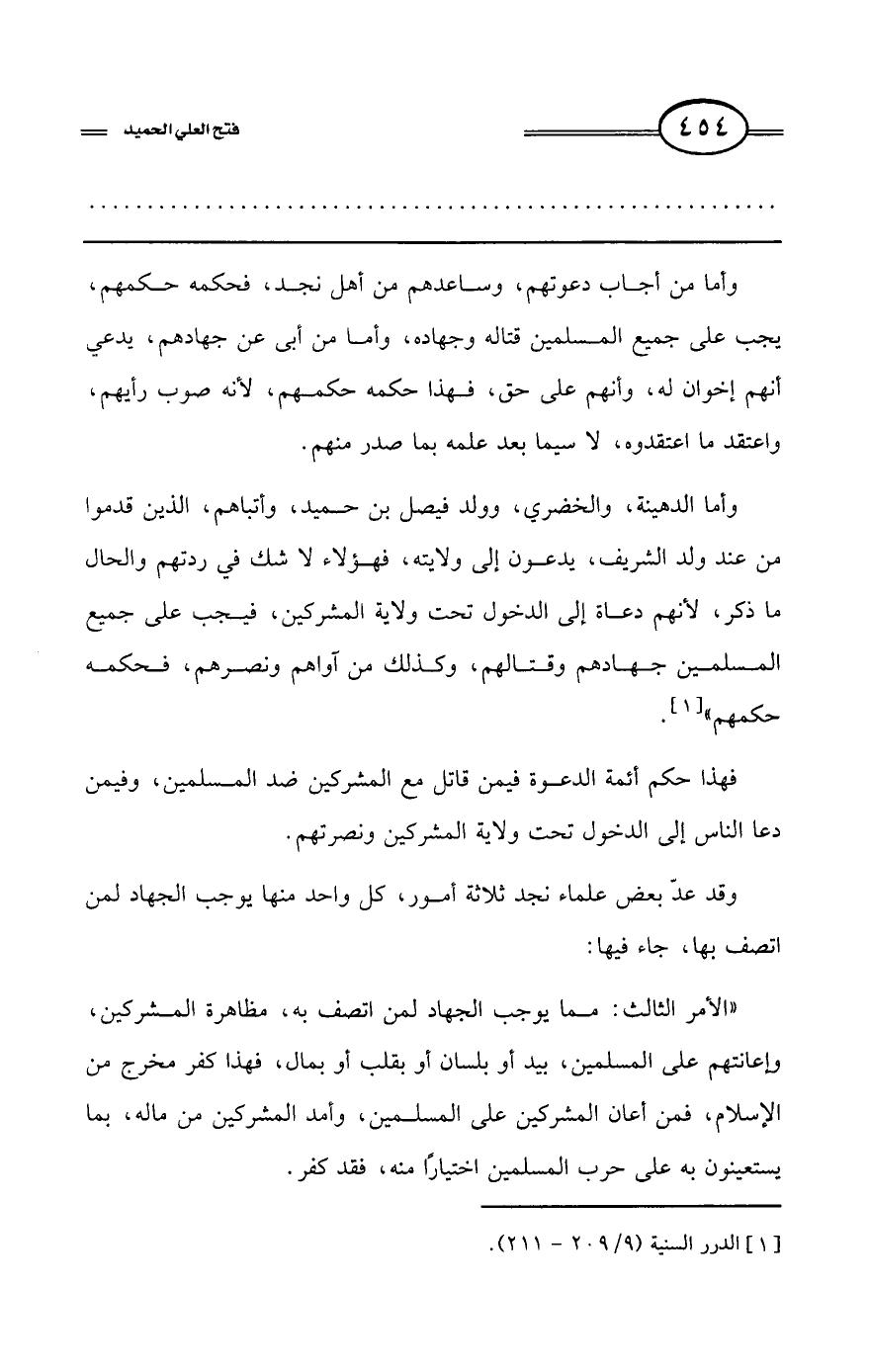 وأما الدهينة، والخضري، وولد فيصل بن حميد، وأتباعهم، الذي قدموا من عند ولد الشريف، يدعون إلى ولايته، فهؤلاء لاشك في ردتهم والحال ما ذكر، لأنهم دعاة الى الدخول تحت ولاية المشركين، فيجب على جميع المسلمين جهادهم وقتالهم، وكذلك من آواهم ونصرهم، فحكمه حكمهم.