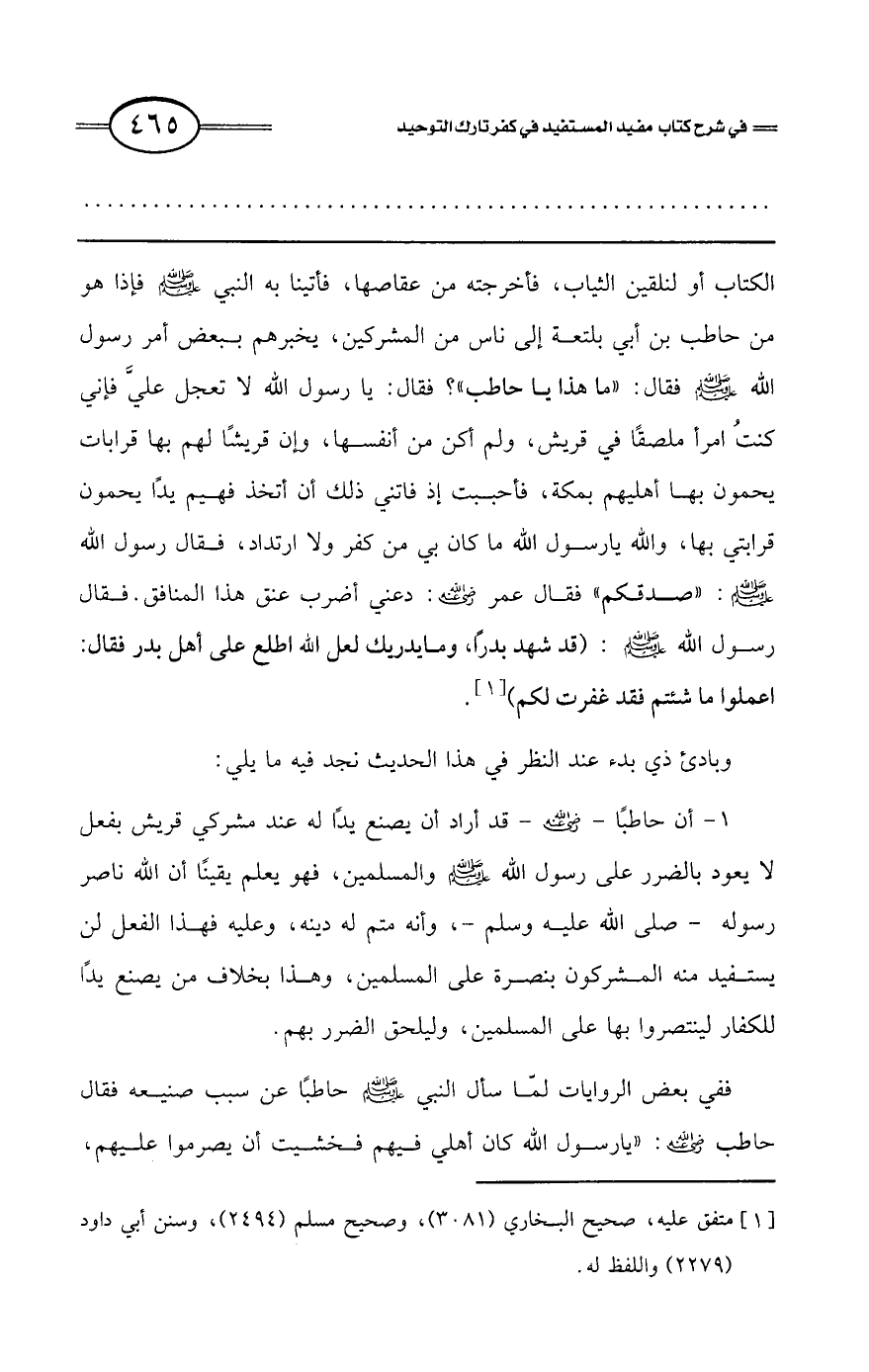 1 - أن حاطبًا - رضي الله عنه - قد أراد أن يصنع يد له عند مشركي قريش بفعل لا يعود بالضرر على رسول الله - صلى الله عليه وسلم - والمسلمين، فهو يعلم يقينًا أن الله ناصر رسوله- صلى الله عليه وسلم- وأنه متم له دينه، وعليه فهذا الفعل لن يستفيد منه المشركون بنصرة على المسلمين، وهذا بخلاف من يصنع يدًا للكفار ليتنصروا بها على المسلمين، وليلحق الضرر بهم.
