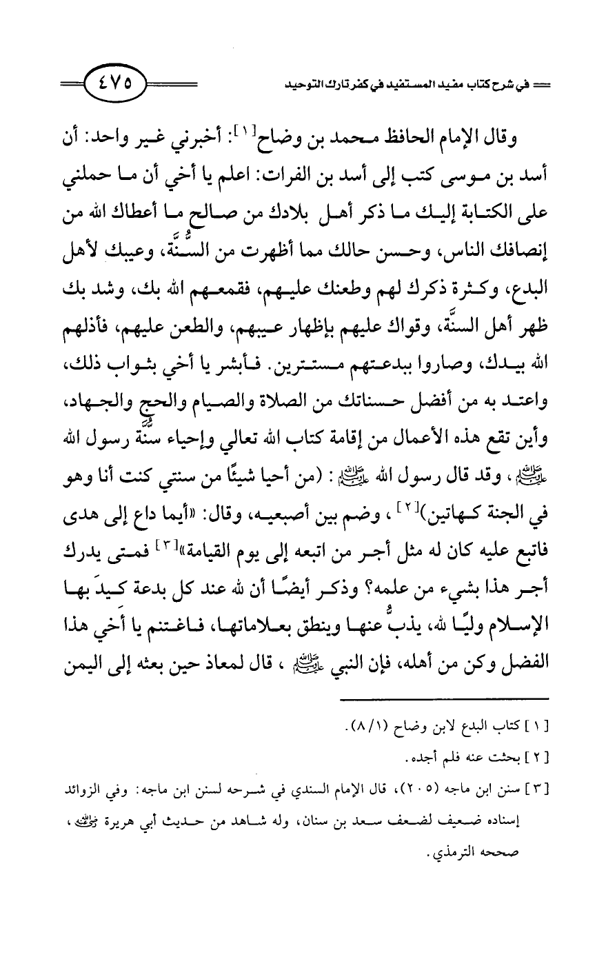 وقال الإمام الحافظ محمد بن وضاح (¬1): أخبرني غير واحد: أن أسد بن موسى كتب إلى أسد بن الفرات: اعلم يا أخي أن ما حملني على الكتابة إليك ما ذكر أهل بلادك من صالح ما أعطاك الله من إنصافك الناس، وحسن حالك مما أظهرت من السنة، وعيبك لأهل البدع، وكثرة ذكرك لهم وطعنك عليهم، فقمعهم الله بك، وشد بك ظهر أهل السنة، وقواك عليهم بإظهار عيبهم، والطعن عليهم، فأذلهم الله يبدك وصاروا ببدعتهم مستترين، فأبشر يا أخي بثواب ذلك، واعتد به من أفضل حسناتك من الصلاة والصيام والحج والجهاد، وأين تقع هذه الأعمال من إقامة كتاب الله تعالى وإحياء سنة رسول الله - صلى الله عليه وسلم -؟ وقد قال رسول الله - صلى الله عليه وسلم -: (من أحيا شيئًا من سنتي كنت أنا وهو في الجنة كهاتين) (¬2)، وضم بين إصبعيه،