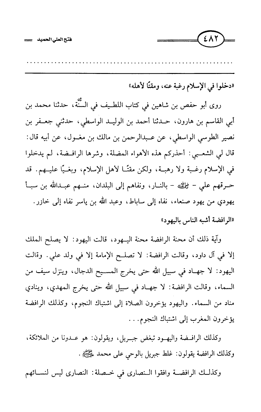 روى أبو حفص بن شاهين في كتاب اللطيف السنة، حدثنا محمد بن أبي القاسم بن هارون، حدثنا أحمد بن الوليد الواسطي، حدثني جعفر بن نصير الطوسي الواسطي، عن عبد الرحمن بن مالك بن مغول، عن أبيه قال: قال لي الشعبي: أحذركم هذه الأهواء المضلة، وشرها الرافضة، لم يدخلوا في الإسلام رغبة ولا رهبة، ولكن مقتًا لأهل الإسلام، وبغيًا عليهم. قد حرقهم على - رضي الله عنه - بالنار، ونفاهم إلى البلدان، منهم عبد الله بن سبأ يهودي من يهود صنعاء، نفاه إلى ساباط، وعبد الله بن ياسر نفاه إلى خازر.