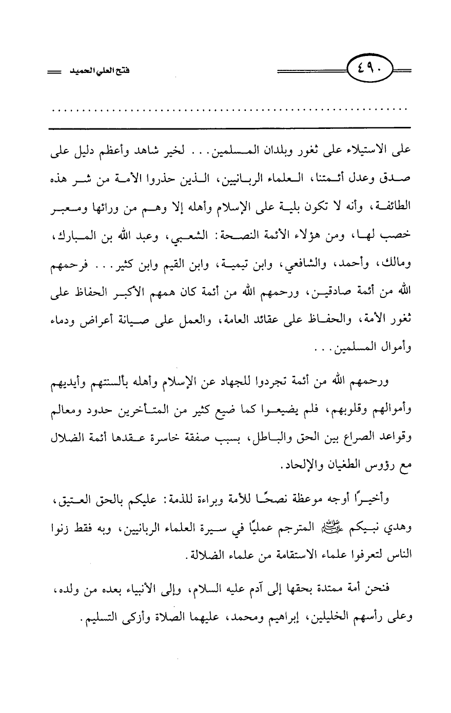 ورحمهم الله من أئمة تجردوا للجهاد عن الإسلام وأهله بألسنتهم وأيديهم وأموالهم وقلوبهم، فلم يضيعوا كما ضيع كثير من المتأخرين حدود ومعالم وقواعد الصراع بين الحق والباطل، بسبب صفقة خاسرة عقدها أئمة الضلال مع رؤوس الطغيان والإلحاد.
