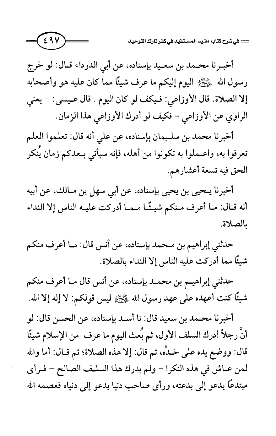 أخبرنا محمد بن سعيد بإسناد، عن أبي الدرداء قال: لو خرج رسول الله - صلى الله عليه وسلم - اليوم إليكم ما عرف شيئًا مما كان عليه هو وأصحابه إلا الصلاة. قال الأوزاعي: فكيف لو كان اليوم.