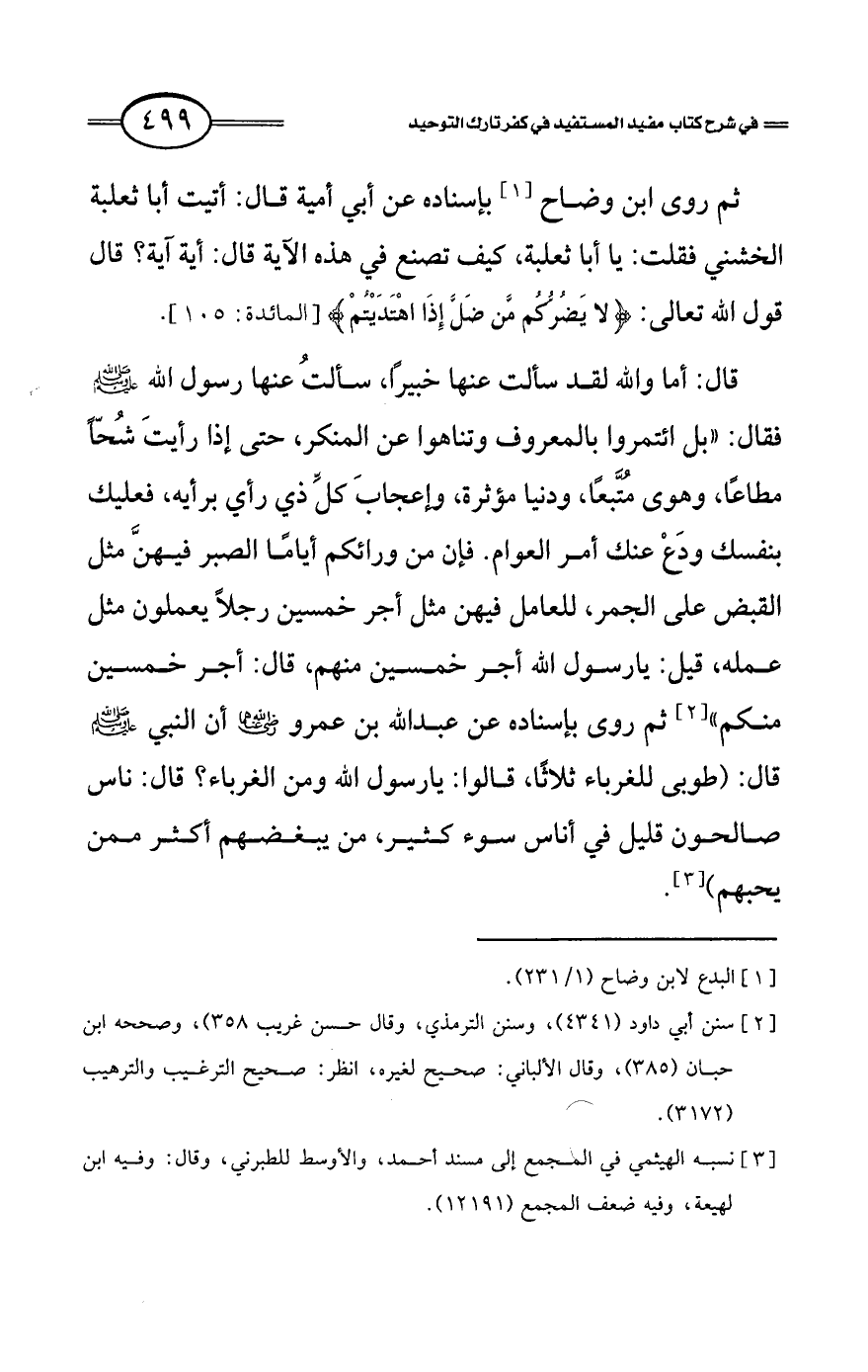 قال: أما والله قد سألت عنها خبيرًا، سألتُ عنها رسول الله - صلى الله عليه وسلم - فقال: «بل ائتمروا بالمعروف وتناهوا عن المنكر، حتى إذا رأيت شُحًا مطاعًا وهوى مُتبعًا، ودنيا مؤثرة، وإعجاب كل ذي رأي برأيه، فعليك بنفسك ودع عنك أمر العوام. فإن من ورائكم أياما الصبر فيهن مثل القبض على الجمر، للعامل فيهن مثل أجر خمسين رجلاً يعملون مثل عمله، قيل يا رسول الله أجر خمسين منهم، قال أجر خمسين منكم» (¬2) ثم روى بإسناده عن عبد الله بن عمرو - رضي الله عنه - أن النبي - صلى الله عليه وسلم - قال: طوبى للغرباء ثلاثًا، قالوا: يا رسول الله ومن الغرباء؟ قال: ناس صالحون قليل في أناس سوء كثير، من يبغضهم أكثر ممن يحبهم (¬3).