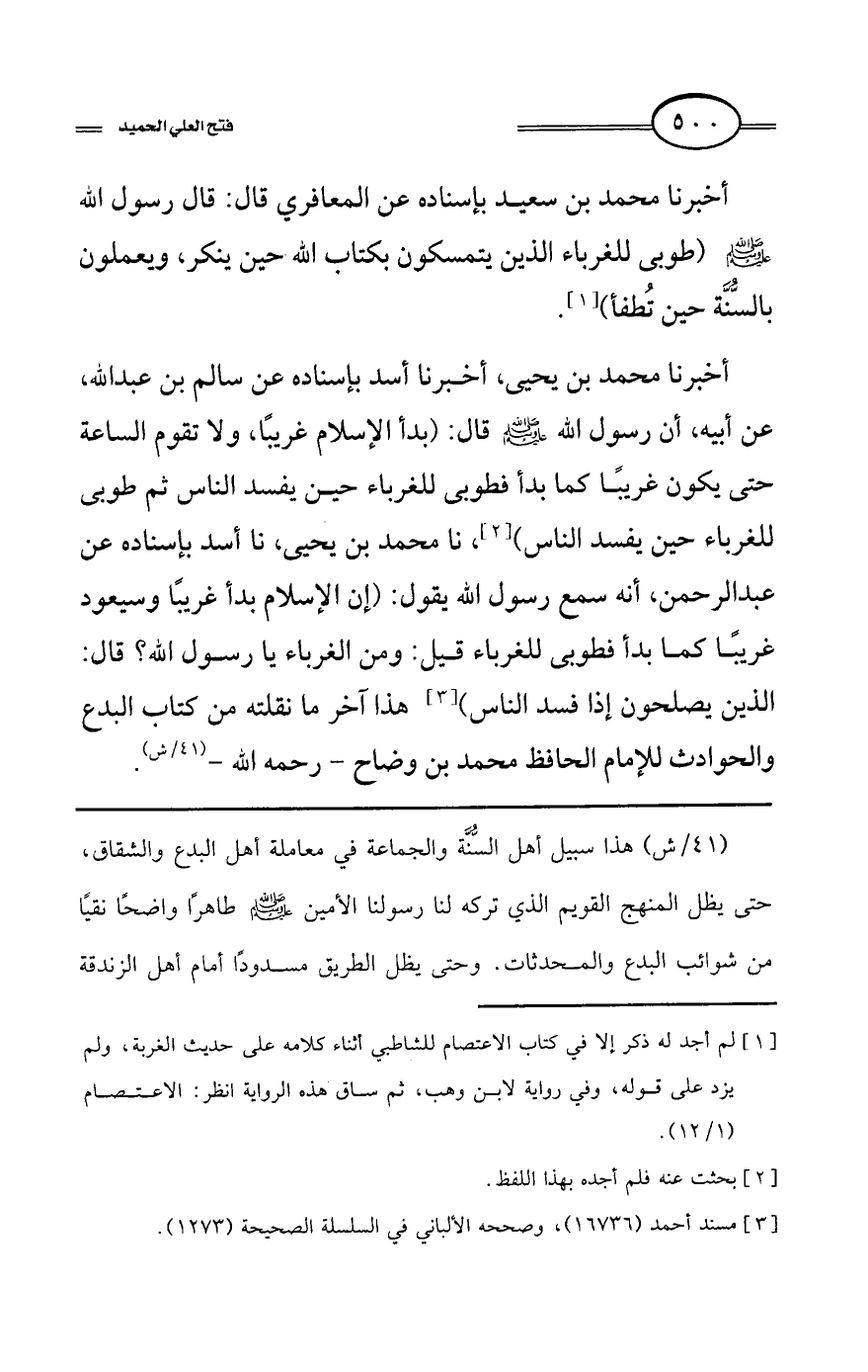 أخبرنا محمد بن يحيى، أخبرنا أسد بإسناده عن سالم بن عبد الله، عن أبيه، أن رسول الله - صلى الله عليه وسلم - قال: (بدأ الإسلام غريبًا، ولا تقوم الساعة حتى يكون غريبًا كما بدأ فطوبى للغرباء حين يفسد الناس ثم طوبى للغرباء حين يفسد الناس) (¬2)، نا محمد بن يحيى، نا أسد بإسناده عن عبد الرحمن، أنه سمع رسول الله يقول: (إن الإسلام بدأ غريبًا وسيعود غريبًا كما بدأ فطوبى للغرباء قيل: ومن الغرباء يا رسول الله؟ قال: الذين يصلحون إذا فسد الناس) (¬3) هذا آخر ما نقلته من كتاب البدع والحوادث للإمام الحافظ محمد بن وضاح - رحمه الله - (41/ش).