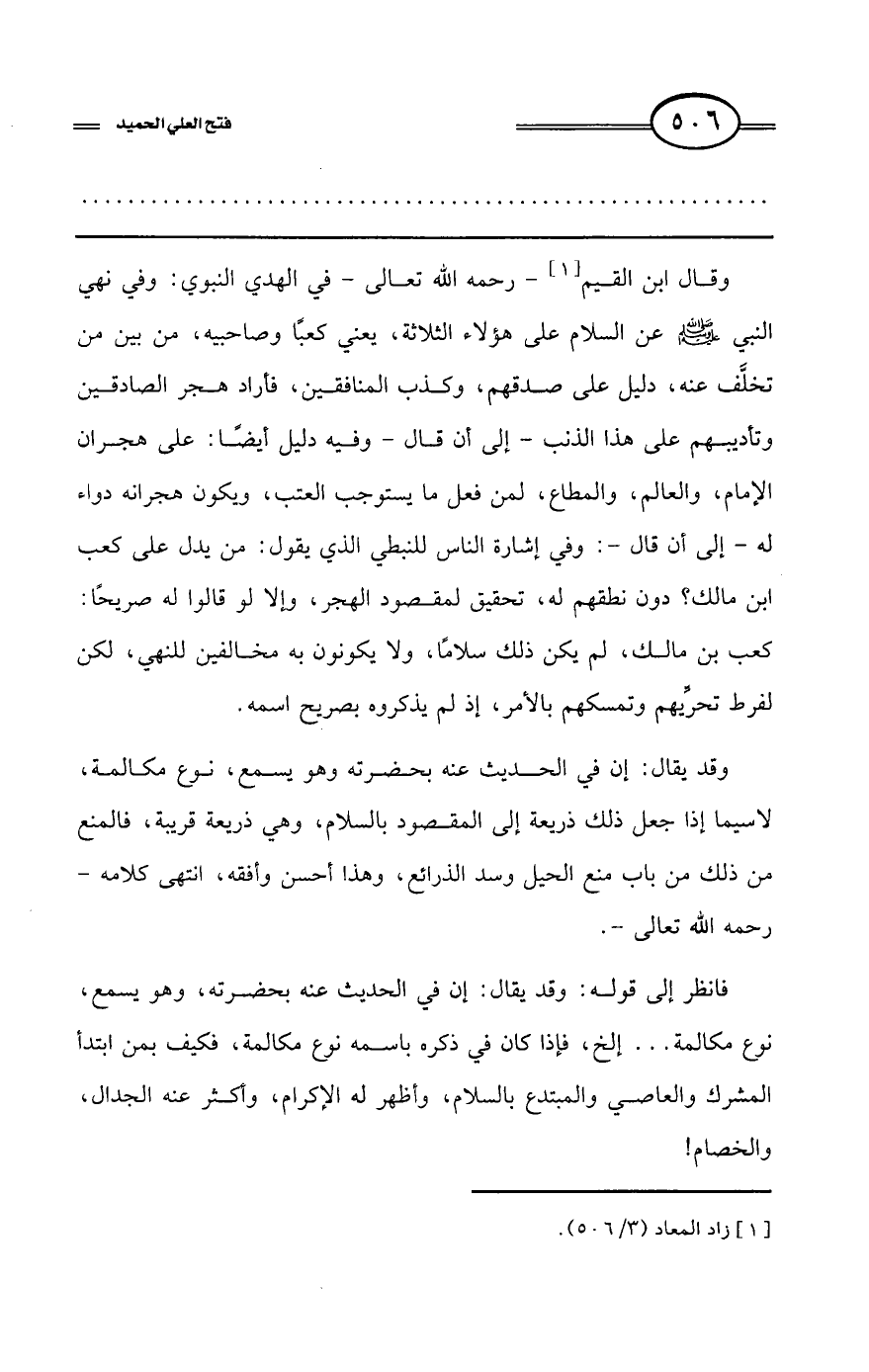 فانظر إلى قوله: وقد يقال: إن في الحديث عنه بحضرته، وهو يسمع، نوع مكالمة ... إلخ، فإذا كان في ذكره باسمه نوع مكالمة، فكيف بمن ابتدأ المشرك والعاصي والمبتدع بالسلام، وأظهر له الإكرام، وأكثر عنه الجدال، والخصام!