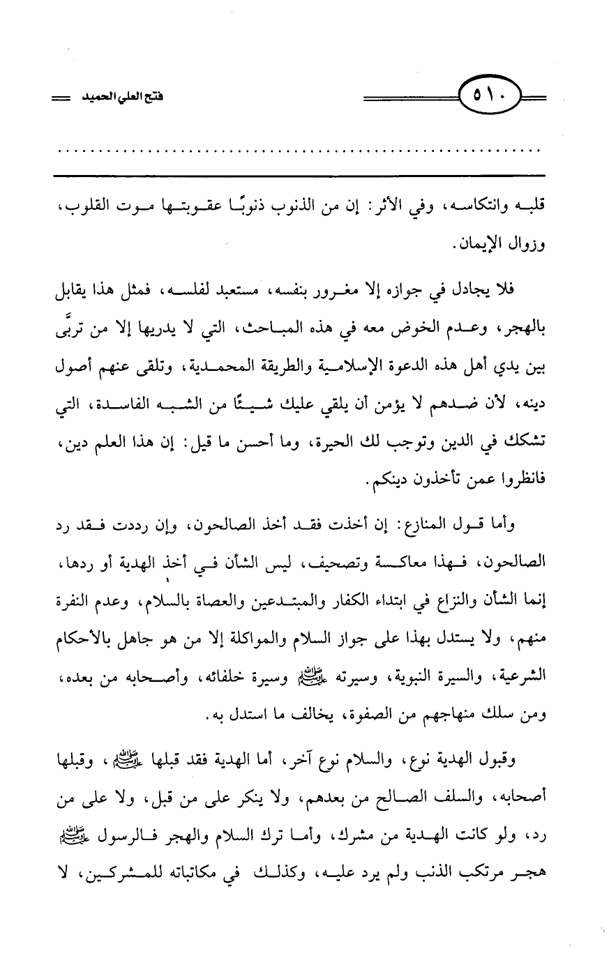 وأما قول المنازع: إن أخذت فقد أخذ الصالحون، وإن رددت فقد رد الصالحون، فهذا معاكسة وتصحيف، ليس الشأن في أخذ الهدية أو ردها، إنما الشأن والنزاع في ابتداء الكفار والمبتدعين والعصاة بالسلام، وعدم النفرة منهم، ولا يستدل بهذا على جواز السلام والمواكلة إلا من هو جاهل بالأحكام الشرعية، والسيرة النبوية، وسيرته - صلى الله عليه وسلم - وسيرة خلفائه وأصحابه من بعده ومن سلك منهاجهم من الصفوة، يخالف ما استدل به.