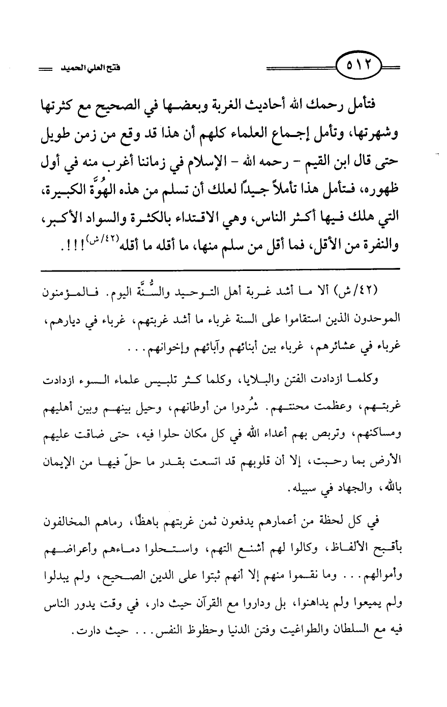 فتأمل رحمك الله أحاديث الغربة وبعضها في الصحيح مع كثرتها وشهرتها، وتأمل إجماع العلماء كلهم أن هذا قد وقع من زمن طويل حتى قال ابن القيم - رحمه الله - الإسلام في زماننا أغرب منه في أول ظهوره، فتأمل هذا تأملاً جيدًَا لعلك أن تسلم من هذه الهُوَّة الكبيرة، التي هلك فيها أكثر الناس، وهي الاقتداء بالكثرة والسواد الأكبر، والنفرة من الأقل، فما أقل من سلم منها، ما أقله ما أقله (42/ش)!!!.
