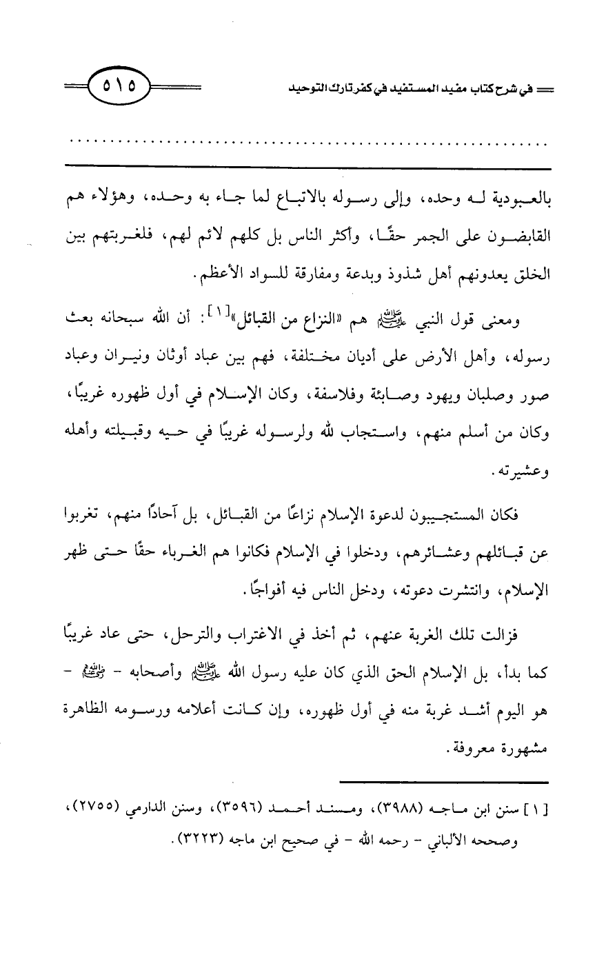 فزالت تلك الغربة عنهم، ثم أخذ في الاغتراب والترحل، حتى عاد غريبًا كما بدأ، بل الإسلام الحق الذي كان عليه رسول الله - صلى الله عليه وسلم - وأصحابه - رضي الله عنهم - هو اليوم أشد غربة منه في أول ظهوره، وإن كانت أعلامه ورسومه الظاهرة مشهورة معروفة.