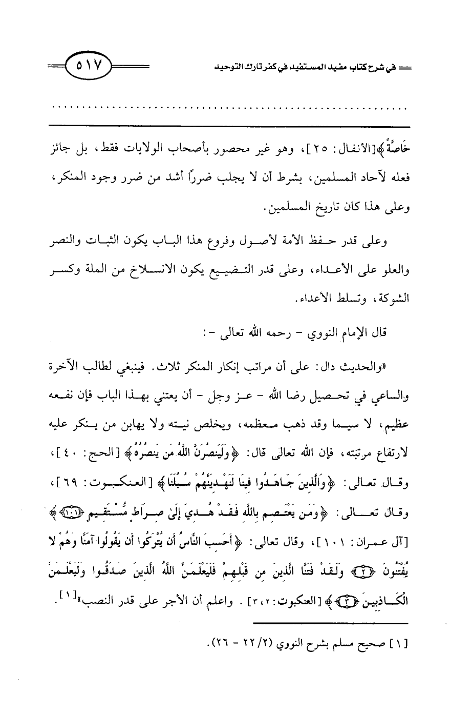 «والحديث دال: على أن مراتب إنكار المنكر ثلاث. فينبغي لطالب الآخرة والساعي في تحصيل رضا الله - عز وجل - أن يعتني بهذا الباب فإن نفعه عظيم، لا سيما وقد ذهب معظمه، ويخلص نيته ولا يهابنَّ من ينكر عليه لارتفاع مرتبته، فإن الله تعالى قال: {وَلَيَنْصُرَنَّ اللَّهُ مَنْ يَنْصُرُهُ} [الحج: 40]، وقال تعالى: {وَالَّذِينَ جَاهَدُوا فِينَا لَنَهْدِيَنَّهُمْ سُبُلَنَا} [العنكبوت: 69]، وقال تعالى: {وَمَنْ يَعْتَصِمْ بِاللَّهِ فَقَدْ هُدِيَ إِلَى صِرَاطٍ مُسْتَقِيمٍ} [آل عمران: 101]، وقال تعالى: {أَحَسِبَ النَّاسُ أَنْ يُتْرَكُوا أَنْ يَقُولُوا آَمَنَّا وَهُمْ لاَ يُفْتَنُونَ * وَلَقَدْ فَتَنَّا الَّذِينَ مِنْ قَبْلِهِمْ فَلَيَعْلَمَنَّ اللَّهُ الَّذِينَ صَدَقُوا وَلَيَعْلَمَنَّ الْكَاذِبِينَ} [العنكبوت: 2، 3]