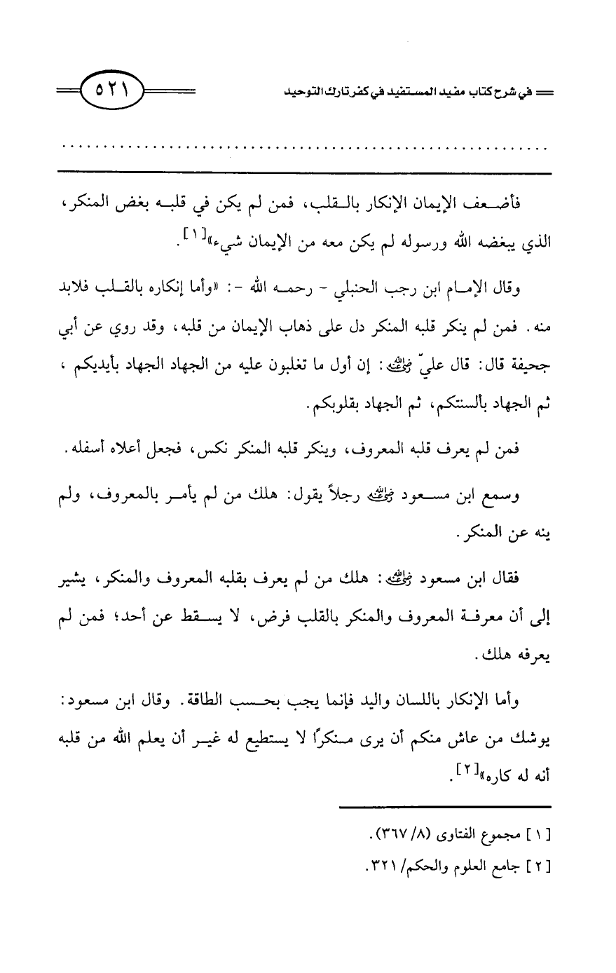 وقال الإمام ابن رجب الحنبلي - رحمه الله -: «وأما إنكاره بالقلب فلابد منه. فمن لم ينكر قلبه المنكر دل على ذهاب الإيمان من قلبه، وقد روي عن أبي جحيفة قال: قال علي رضي الله عنه: إن أول ما تغلبون عليه من الجهاد الجهاد بأيديكم، ثم الجهاد بألسنتكم، ثم الجهاد بقلوبكم.