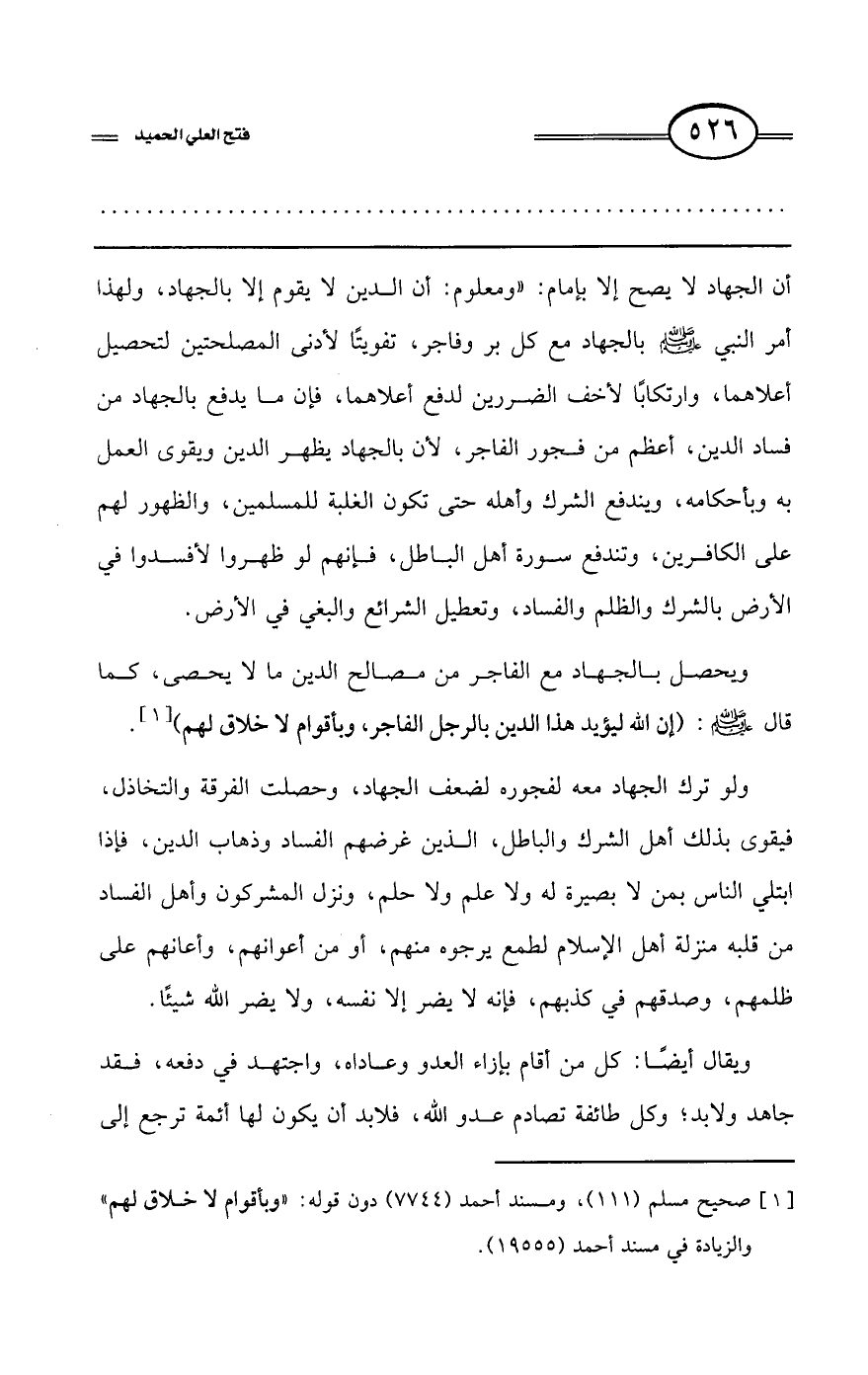 أن الجهاد لا يصح إلا بإمام: «ومعلوم: أن الدين لا يقوم إلا بالجهاد، ولهذا أمر النبي - صلى الله عليه وسلم - بالجهاد مع كل بر وفاجر، تفويتًا لأدني المصلحتين لتحصيل أعلاهما، وارتكابًا لأخف الضررين لدفع أعلاهما، فإن ما يدفع بالجهاد من فساد الدين، أعظم من فجور الفاجر، لأن بالجهاد يظهر الدين ويقوى العمل به وبأحكامه، ويندفع الشرك وأهله حتى تكون الغلبة للمسلمين، والظهور لهم على الكافرين، وتندفع سورة أهل الباطل، فإنهم لو ظهروا لأفسدوا في الأرض بالشرك والظلم والفساد، وتعطيل الشرائع والبغي في الأرض.