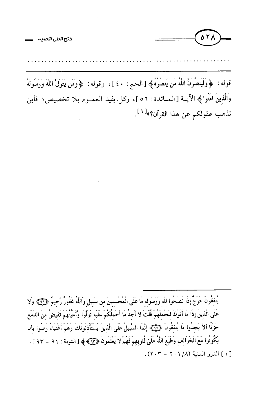قوله: {وَلَيَنْصُرَنَّ اللَّهُ مَنْ يَنْصُرُهُ} [الحج: 40]، وقوله: {وَمَنْ يَتَوَلَّ اللَّهَ وَرَسُولَهُ وَالَّذِينَ آَمَنُوا} الآية [المائدة: 56]، وكل يفيد العموم بلا تخصيص، فأين تذهب عقولكم عن هذا القرآن؟» (¬1).