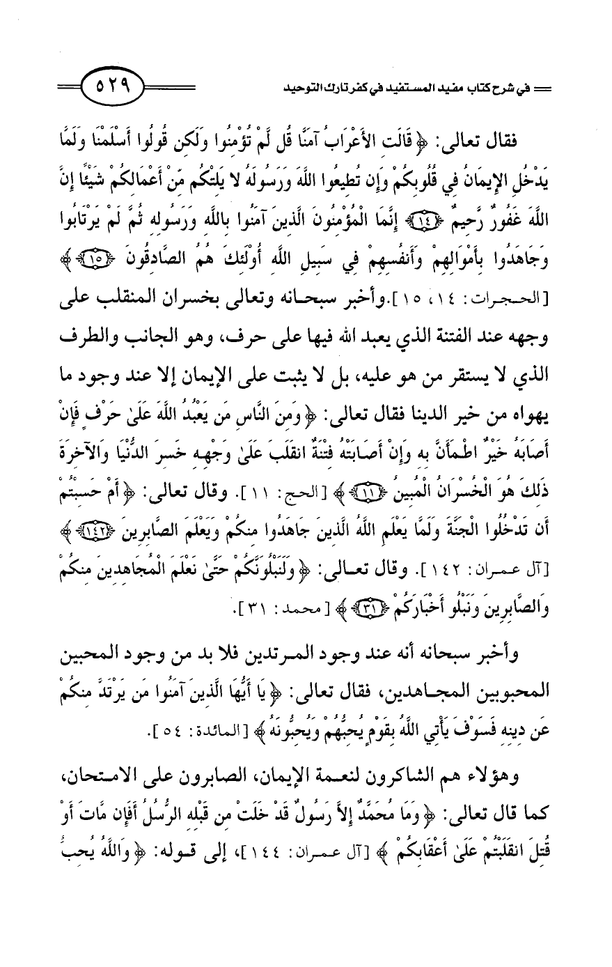 فقال تعالى: {قَالَتِ الأَعْرَابُ آَمَنَّا قُلْ لَمْ تُؤْمِنُوا وَلَكِنْ قُولُوا أَسْلَمْنَا وَلَمَّا يَدْخُلِ الْإِيمَانُ فِي قُلُوبِكُمْ وَإِنْ تُطِيعُوا اللَّهَ وَرَسُولَهُ لاَ يَلِتْكُمْ مِنْ أَعْمَالِكُمْ شَيْئًا إِنَّ اللَّهَ غَفُورٌ رَحِيمٌ * إِنَّمَا الْمُؤْمِنُونَ الَّذِينَ آَمَنُوا بِاللَّهِ وَرَسُولِهِ ثُمَّ لَمْ يَرْتَابُوا وَجَاهَدُوا بِأَمْوَالِهِمْ وَأَنْفُسِهِمْ فِي سَبِيلِ اللَّهِ أُولَئِكَ هُمُ الصَّادِقُونَ} [الحجرات: 14، 15] وأخبر سبحانه وتعالى بخسران المنقلب على وجه عند الفتنة الذي يعبد الله فيها على حرف، وهو الجانب والطرف الذي لا يستقر من هو عليه، بل لا يثبت على الإيمان إلا عند وجود ما يهواه من خير الدنيا فقال تعالى: {وَمِنَ النَّاسِ مَنْ يَعْبُدُ اللَّهَ عَلَى حَرْفٍ فَإِنْ أَصَابَهُ خَيْرٌ اطْمَأَنَّ بِهِ وَإِنْ أَصَابَتْهُ فِتْنَةٌ انْقَلَبَ عَلَى وَجْهِهِ خَسِرَ الدُّنْيَا وَالْآَخِرَةَ ذَلِكَ هُوَ الْخُسْرَانُ الْمُبِينُ} [الحج: 11].