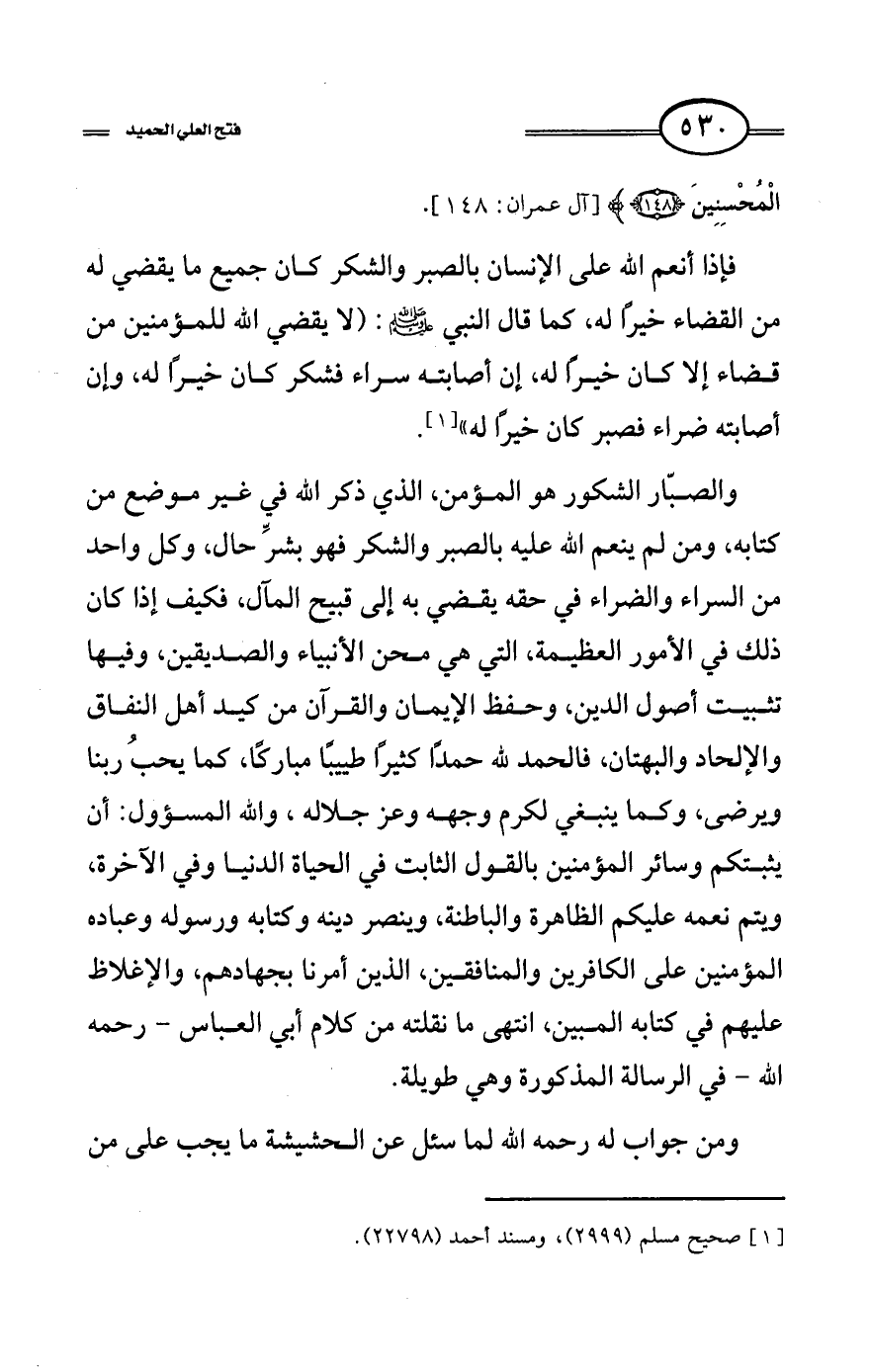 والصبّار الشكور هو المؤمن، الذي ذكر الله في غير موضع من كتابه، ومن لم ينعم الله عليه بالصبر والشكر فهو بشر حال، وكل واحد من السراء والضراء في حقه يقضي به إلى قبيح المآل، فكيف إذا كان ذلك في الأمور العظيمة، التي هي محن الأنبياء والصديقين، وفيها تثبيت أصول الدين، وحفظ الإيمان والقرآن من كيد أهل النفاق والإلحاد والبهتان، فالحمد لله حمدًا كثيرا طيبًا مباركًا، كما يحبُ ربنا ويرضى، وكما ينبغي لكرم وجهه وعز جلاله، والله المسؤول: أن يثبتكم وسائر المؤمنين بالقول الثابت في الحياة الدنيا وفي الآخرة، ويتم نعمه عليكم الظاهرة والباطنة، وينصر دينه وكتابه ورسوله وعباده المؤمنين على الكافرين والمنافقين، الذين أمرنا بجهادهم، والإغلاظ عليهم في كتابه المبين، انتهى ما نقلته من كلام أبي العباس - رحمه الله - في الرسالة المذكورة وهي طويلة.