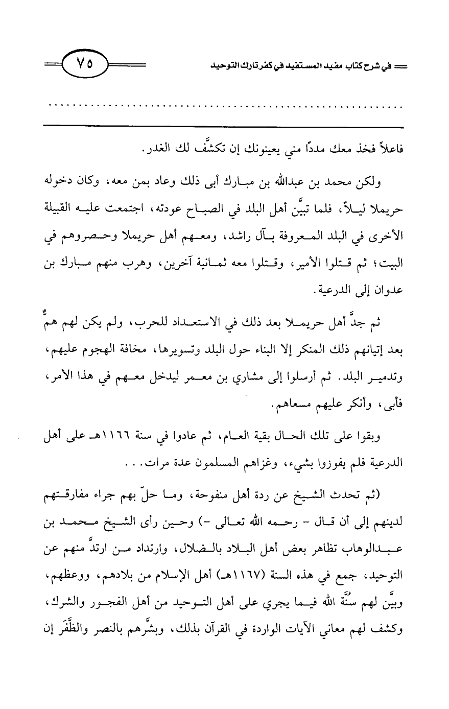 (ثم تحدث الشيخ عن ردة أهل منفوحة، وما حلّ بهم جراء مفارقتهم لدينهم إلى أن قال - رحمه الله تعالى) وحين رأى الشيخ محمد بن عبد الوهاب تظاهر بعض أهل البلاد بالضلال، وارتداد من ارتدَّ منهم عن التوحيد، جمع في هذه السنة (1167 هـ) أهل الإسلام من بلادهم، ووعظم وبيَّن لهم سُنَّة الله فيما يجري على أهل التوحيد من أهل الفجور والشرك وكشف