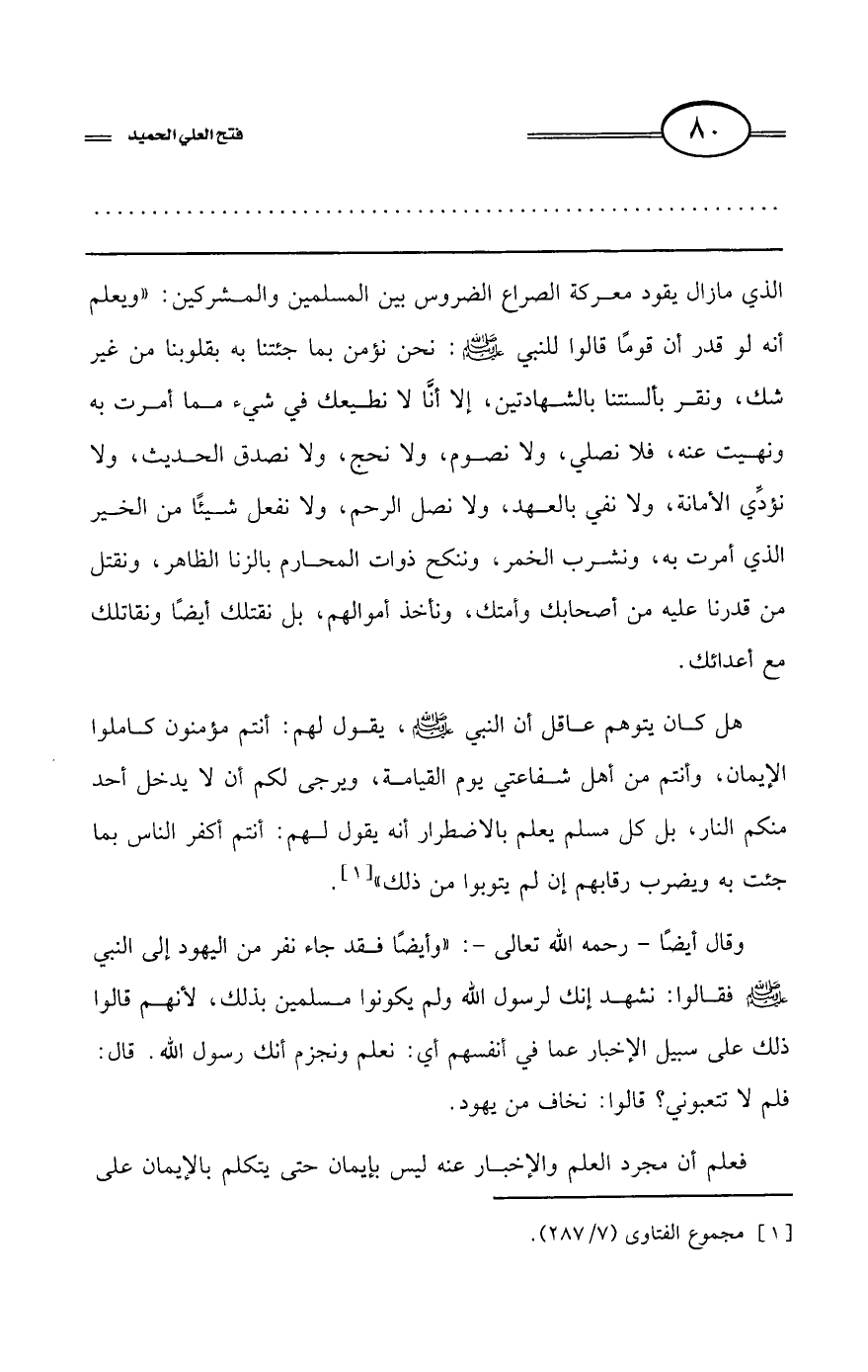 الذي مازال يقود معركة الصراع الضروس بين المسلمين والمشركين: «ويعلم أنه لو قدر أن قومًا قالوا للنبي - صلى الله عليه وسلم -: نحن نؤمن بما جئتنا به بقلوبنا من غير شك، ونقر بألسنتنا بالشهادتين، إلا أنَّا لا نطيعك في شيء مما أمرت به ونهيت عنه، فلا نصلي، ولا نصوم، ولا نحج، ولا نصدق الحديث، ولا نؤدي الأمانة، ولا نفي بالعهد، ولا نصل الرحم، ولا نفعل شيئًا من الخير الذي أمرت به، ونشرب الخمر، وننكح ذوات المحارم بالزنا الظاهر، ونقتل من قدرنا عليه من أصحابك وأمتك، ونأخذ أموالهم، بل نقتلك أيضًا ونقاتلك مع أعدائك».