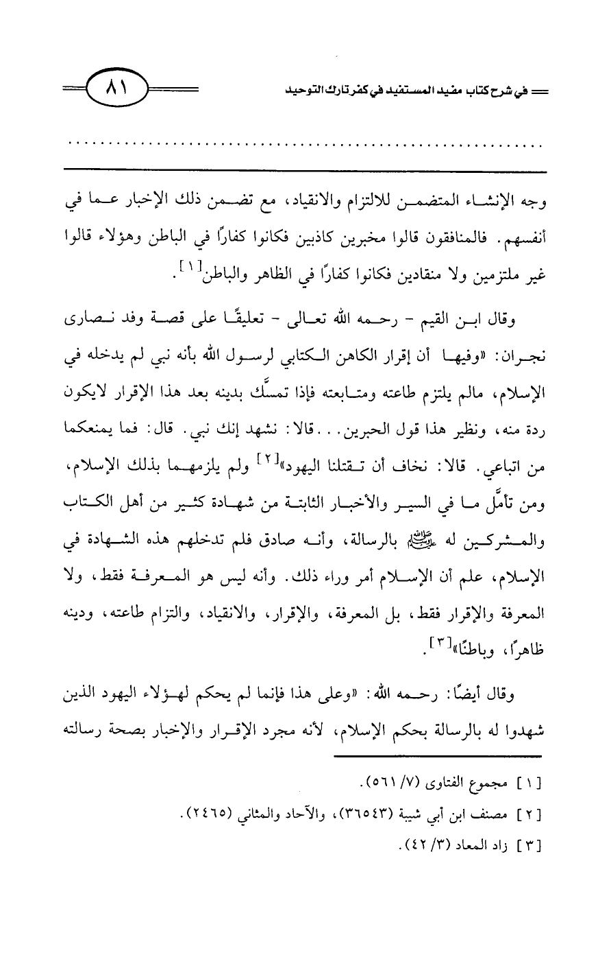 وقال ابن القيم - رحمه الله تعالى- تعليقًا على قصة وفد نصارى نجران: «وفيها أن إقرار الكاهن الكتابي لرسول الله بأنه نبي لم يدخله في الإسلام، ما لم يلتزم طاعته ومتابعته فإذا تمسَّك بدينه بعد هذا الإقرار لا يكون ردة منه، ونظير هذا قول الحبرين ... قالا: نشهد إنك نبي. قال: فما يمنعكما من اتباعي. قالا: نخاف أن تقتلنا اليهود» (¬2) ولم يلزمهما بذلك الإسلام، ومن تأمَّل ما في السير والأخبار الثابتة من شهادة كثير من أهل الكتاب والمشركين له - صلى الله عليه وسلم - بالرسالة، وأنه صادق فلم تدخلهم هذه الشهادة في الإسلام، علم أن الإسلام أمر وراء ذلك. وأنه ليس هو المعرفة فقط، ولا المعرفة والإقرار فقط، بل المعرفة، والإقرار، والانقياد، والتزام طاعته، ودينه ظاهرًا، وباطنًا» (¬3).