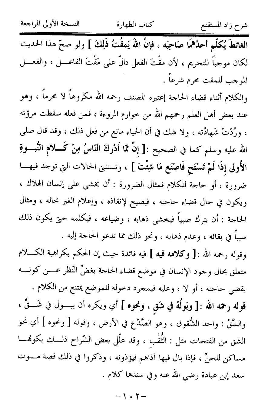 والكلام أثناء قضاء الحاجة إعتبره المصنف رحمه الله مكروهاً لا محرماً، وهو عند بعض أهل العلم رحمهم الله من خوارم المروءة، فمن فعله سقطت مرؤته، ورُدّتْ شَهادُته، ولا شك في أن الحياء مانع من فعل ذلك، وقد قال صَلَّى اللَّهُ عَلَيْهِ وَسَلَّمَ كما في الصحيح: [إِن مما أَدْركَ النّاسُ مِنْ كَلامِ النُّبوةِ الأُولى إِذَا لَمْ تَسْتَحِ فَاصْنَع ما شِئْتَ]، وتستثنى الحالات التي توجد فيها ضرورة، أو حاجة للكلام فمثال الضرورة: أن يخشى على إنسان الهلاك، ويكون في حال قضاء حاجته، فيصيح لإنقاذه، وإعلام الغير بحاله، ومثال الحاجة: أن يترك صبياً فيخشى ذهابه، وضياعه، فيكلمه حتى يكون ذلك سبباً في بقائه، وعدم ذهابه، ونحو ذلك مما تدعو الحاجة إليه.