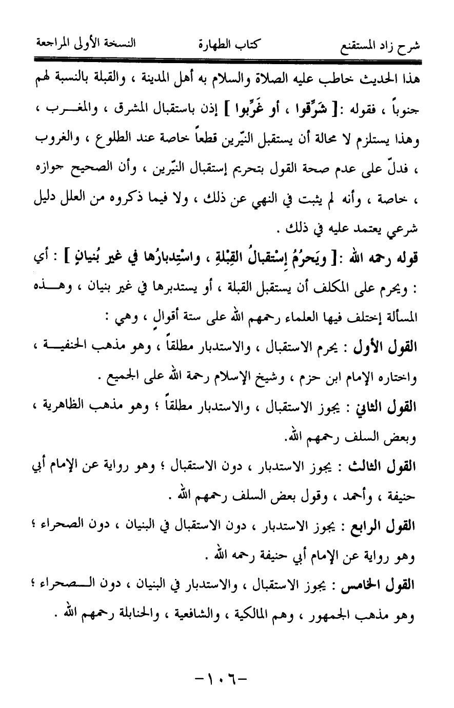 قوله رحمه الله: [ويَحرُمُ إِسْتقبالُ القِبلةِ، واسْتِدبارُها في غير بُنيانٍ]: أي: ويحرم على المكلف أن يستقبل القبلة، أو يستدبرها في غير بنيان، وهذه المسألة إختلف فيها العلماء رحمهم الله على ستة أقوال، وهي:
