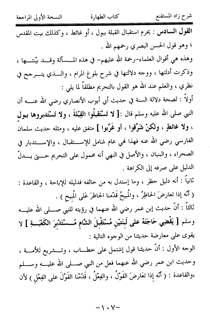 ثالثاً: أنّ حديث إبن عمر رضي الله عنهما في رؤيته للنبي صَلَّى اللَّهُ عَلَيْهِ وَسَلَّمَ [يَقْضِي حَاجَتَهُ على لَبِنَتيْنِ مُسْتَقْبِلَ الشَّامِ مُسْتَدْبِرَ الكَعْبَةِ] لا يقوى على معارضة حديثنا من الوجوه التالية: