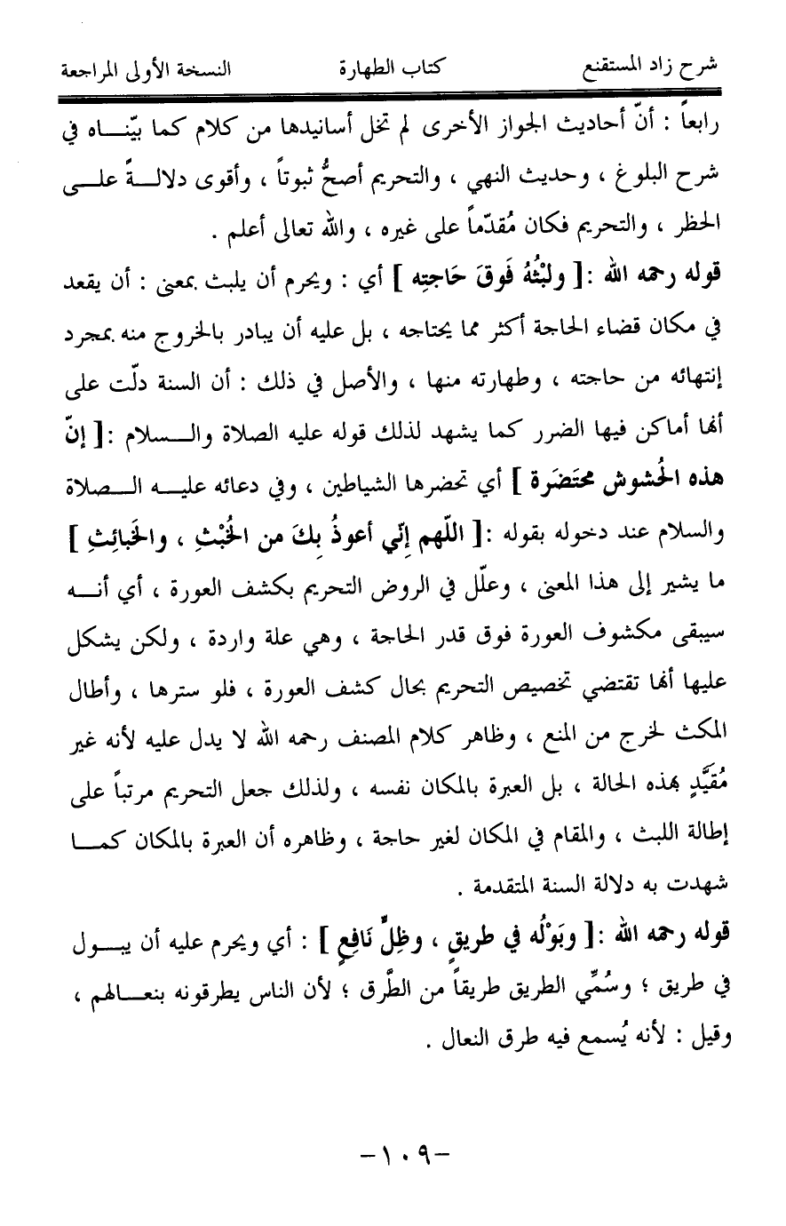 قوله رحمه الله: [وبَولُه في طريقٍ، وظلٍّ نَافِع]: أي ويحرم عليه أن يبول في طريق؛ وسُمِّي الطريق طريقاً من الطَّرق؛ لأن الناس يطرقونه بنعالهم، وقيل: لأنه يُسمع فيه طرق النعال.