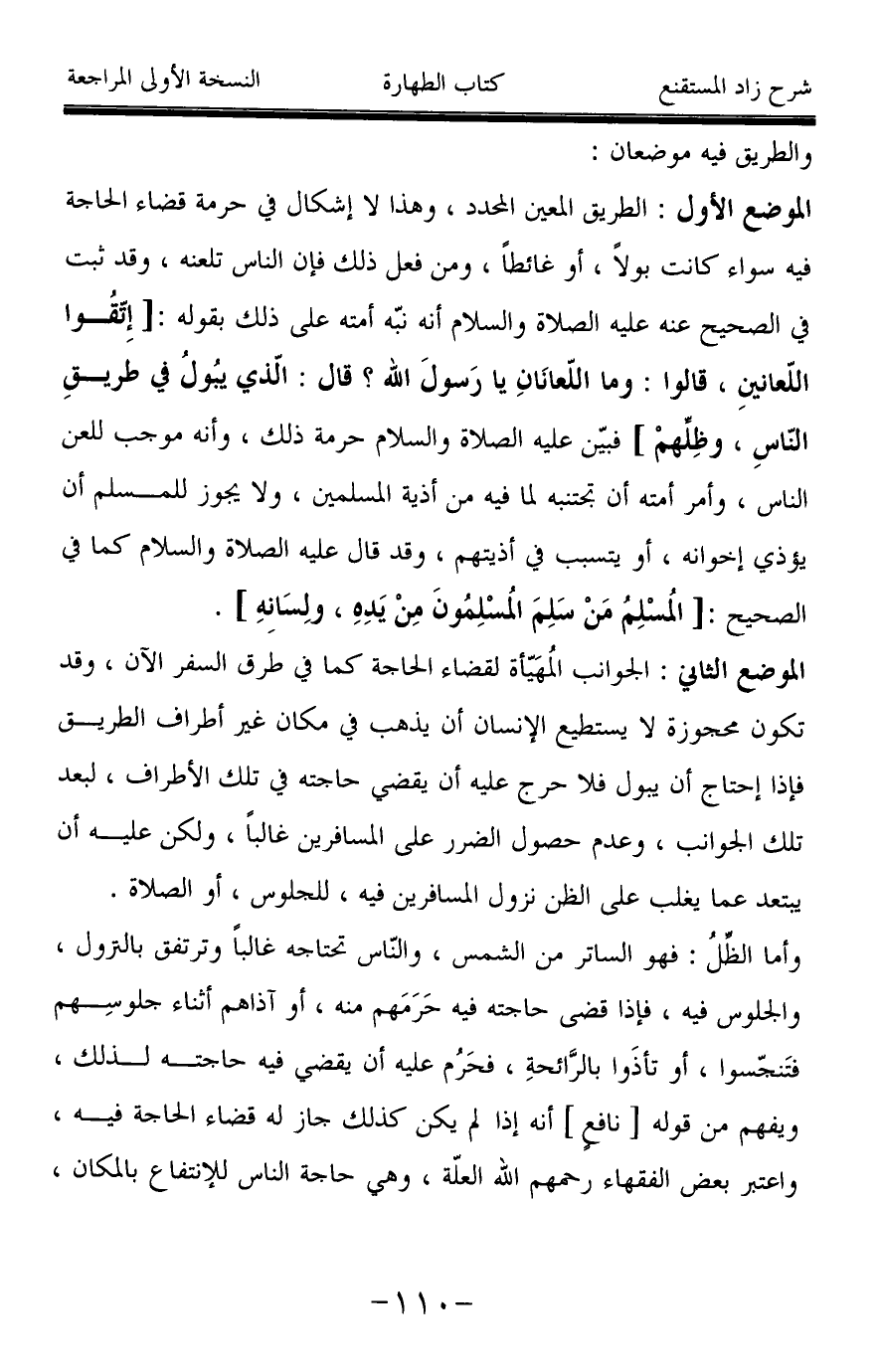 الموضع الأول: الطريق المعين المحدد، وهذا لا إشكال في حرمة قضاء الحاجة فيه سواء كانت بولاً، أو غائطاً، ومن فعل ذلك فإن الناس تلعنه، وقد ثبت في الصحيح عنه عليه الصلاة والسلام أنه نبّه أمته على ذلك بقوله: [إِتّقُوا اللّعانينِ، قالوا: وما اللّعانَانِ يا رَسولَ الله؟ قال: الّذي يبُولُ في طريقِ النّاسِ، وظِلهمْ] فبيّن عليه الصلاة والسلام حرمة ذلك، وأنه موجب للعن الناس، وأمر أمته أن تجتنبه لما فيه من أذية المسلمين، ولا يجوز للمسلم أن يؤذي إخوانه، أو يتسبب في أذيتهم، وقد قال عليه الصلاة والسلام كما في الصحيح: [الُمسْلِمُ مَنْ سَلِمَ الُمسْلِمُونَ مِنْ يَدِهِ، ولِسَانِهِ].