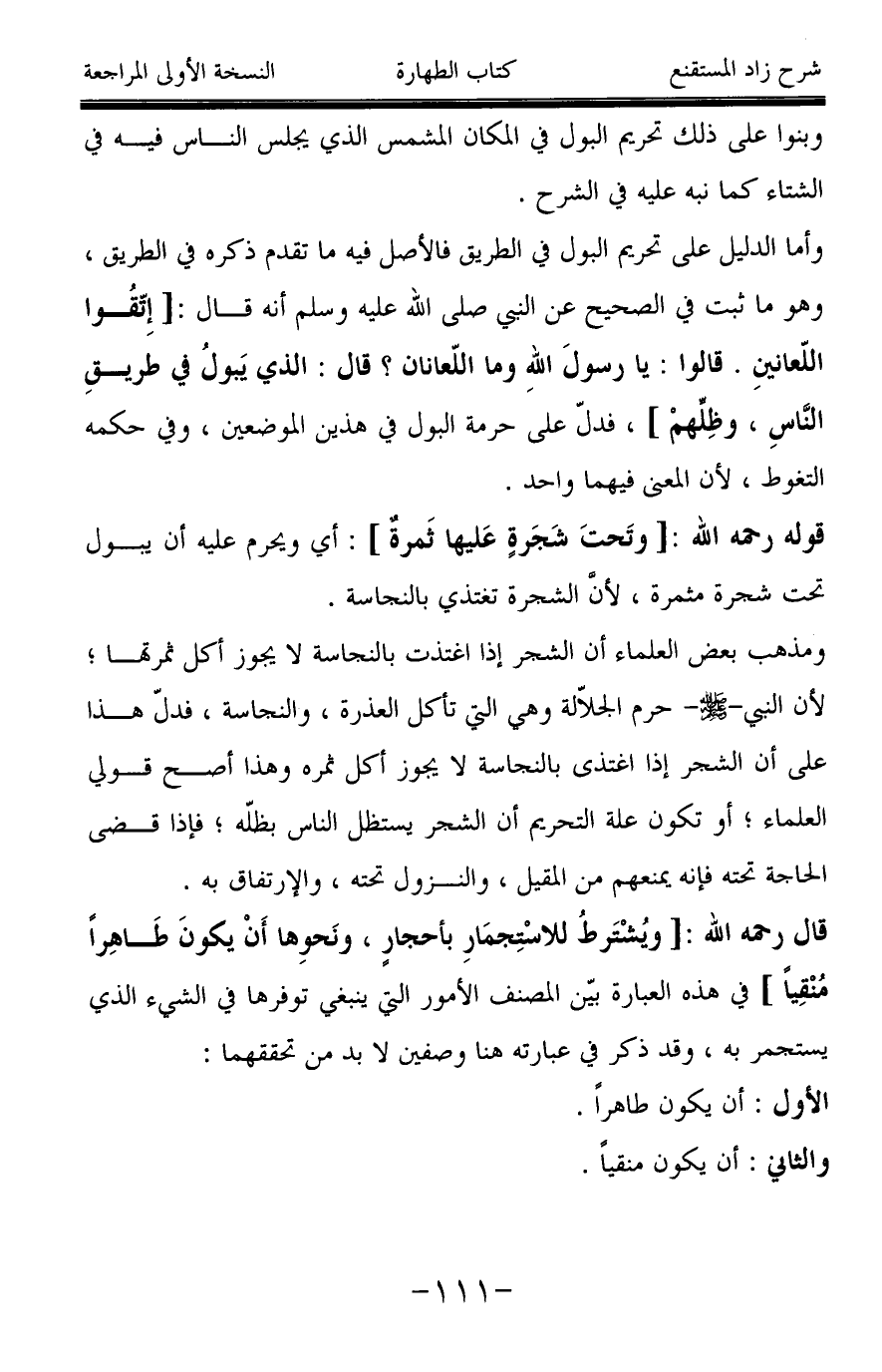 قوله رحمه الله: [وتَحتَ شَجَرةٍ عَليها ثَمرةٌ]: أي ويحرم عليه أن يبول تحت شجرة مثمرة، لأن الشجرة تغتذي بالنجاسة.