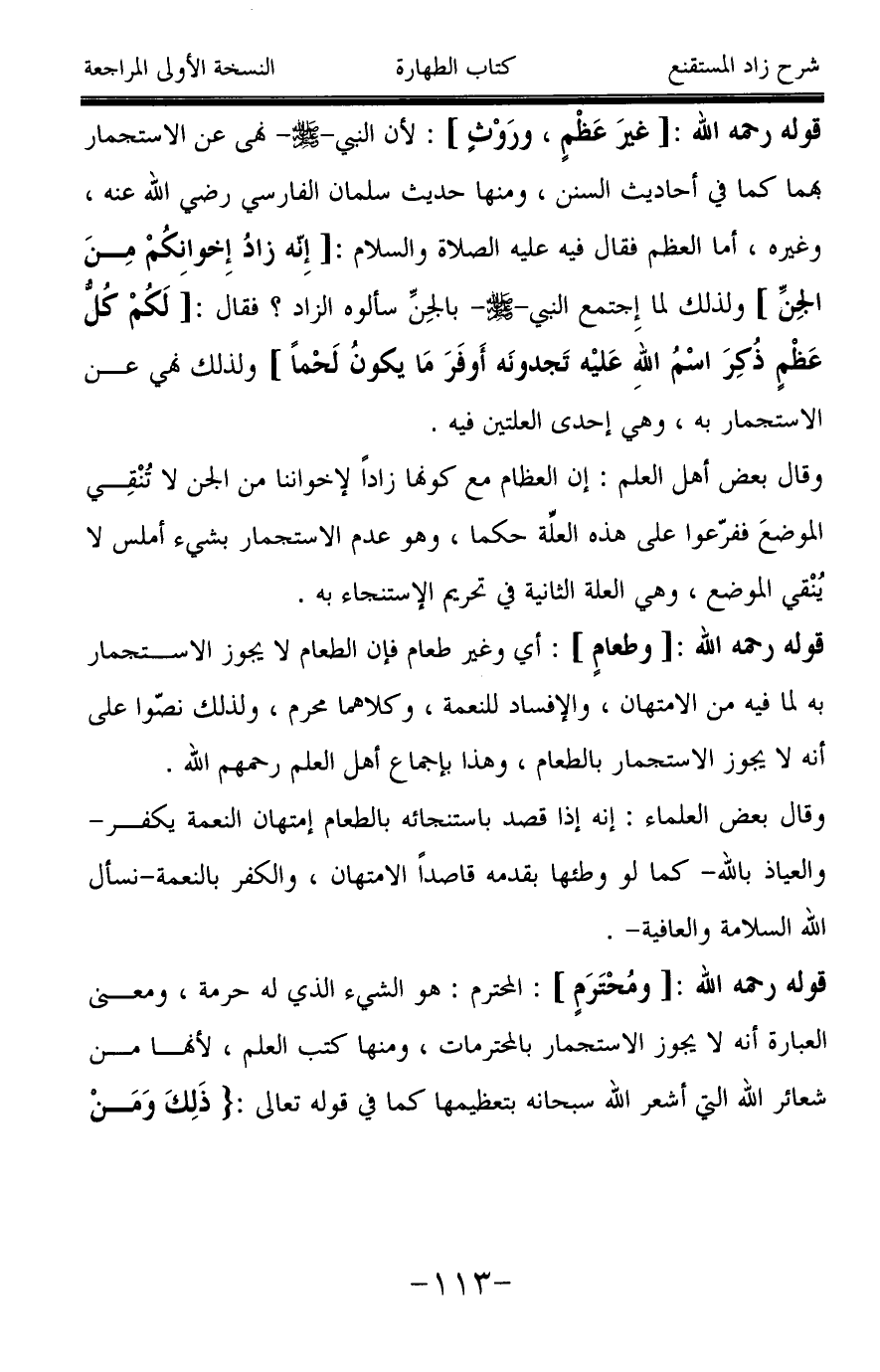 قوله رحمه الله: [وطعامٍ]: أي وغير طعام فإن الطعام لا يجوز الاستجمار به لما فيه من الامتهان، والإفساد للنعمة، وكلاهما محرم، ولذلك نصّوا على أنه لا يجوز الاستجمار بالطعام، وهذا بإجماع أهل العلم رحمهم الله.