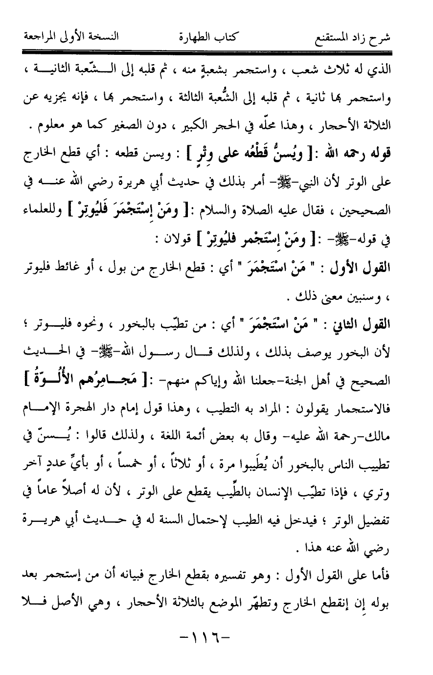 القول الأول: " مَنْ اسْتَجْمَرَ " أي: قطع الخارج من بول، أو غائط فليوتر، وسنبين معنى ذلك.