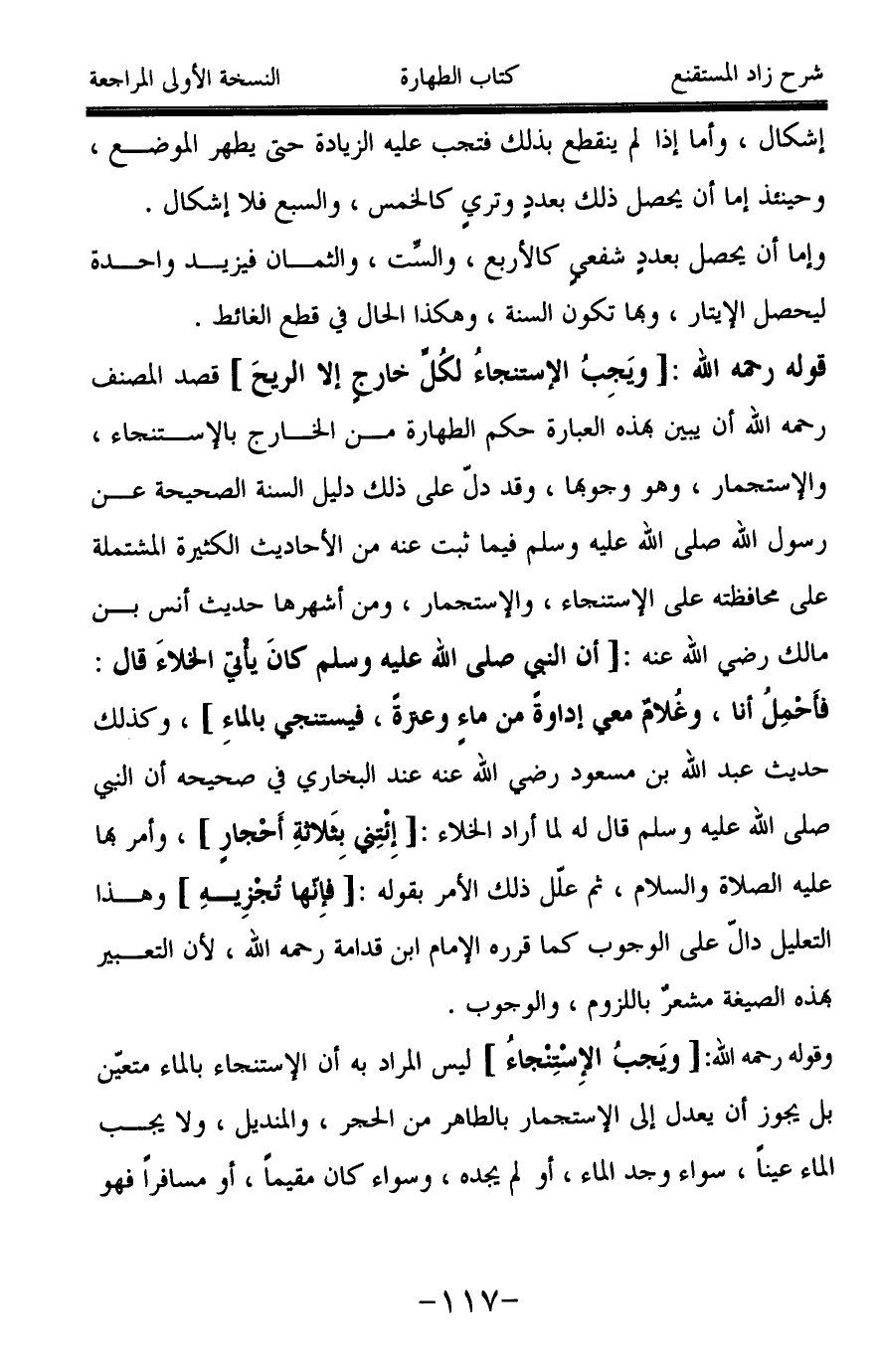 وقوله رحمه الله: [ويَجبُ الإِسْتِنْجاءُ] ليس المراد به أن الإستنجاء بالماء متعيّن بل يجوز أن يعدل إلى الإستجمار بالطاهر من الحجر، والمنديل، ولا يجب الماء عيناً، سواء وجد الماء، أو لم يجده، وسواء كان مقيماً، أو مسافراً فهو