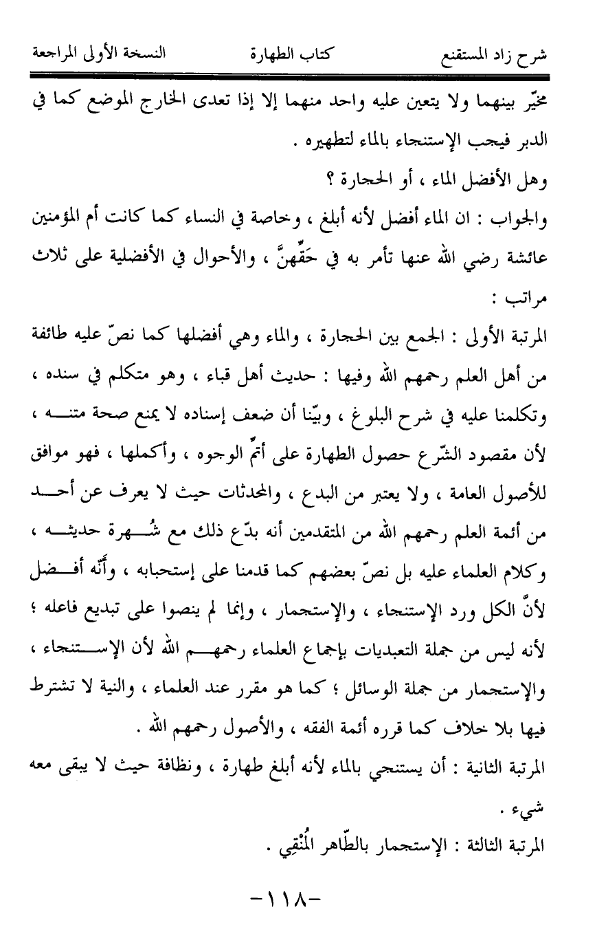 المرتبة الأولى: الجمع بين الحجارة، والماء وهي أفضلها كما نصّ عليه طائفة من أهل العلم رحمهم الله وفيها: حديث أهل قباء، وهو متكلم في سنده، وتكلمنا عليه في شرح البلوغ، وبيّنا أن ضعف إسناده لا يمنع صحة متنه، لأن مقصود الشّرع حصول الطهارة على أتمِّ الوجوه، وأكملها، فهو موافق للأصول العامة، ولا يعتبر من البدع، والمحدثات حيث لا يعرف عن أحد من أئمة العلم رحمهم الله من المتقدمين أنه بدّع ذلك مع شُهرة حديثه، وكلام العلماء عليه بل نصّ بعضهم كما قدمنا على إستحبابه، وأنه أفضل لأن الكل ورد الإستنجاء، والإستجمار، وإنما لم ينصوا على تبديع فاعله؛ لأنه ليس من جملة التعبديات بإجماع العلماء رحمهم الله لأن الإستنجاء، والإستجمار من جملة الوسائل؛ كما هو مقرر عند العلماء، والنية لا تشترط فيها بلا خلاف كما قرره أئمة الفقه، والأصول رحمهم الله.