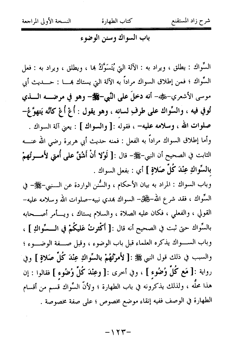 وباب السواك: المراد به بيان الأحكام، والسُّنن الواردة عن النبي -صَلَّى اللَّهُ عَلَيْهِ وَسَلَّمَ- في السَواك، فقد شرع الله -عز وجل- السواك بهدي نبيه -صلوات الله وسلامه عليه- القولي، والفعلي، فكان عليه الصلاة، والسلام يستاك، ويأمر أصحابه بالسِّواك حتى ثبت في الصحيح أنه قال: [أَكْثرتُ عَليكُمْ في السِّواكِ]، وباب السواك يذكره العلماء قبل باب الوضوء، وقبل صفة الوضوء؛ والسبب في ذلك قول النبي -صَلَّى اللَّهُ عَلَيْهِ وَسَلَّمَ-: [لأَمرتهُمْ بالسِّواكِ عِنْدَ كُلِّ صَلاةٍ] وفي رواية: [مَع كُلِّ وُضُوءٍ]، وفي أخرى: [وعِنْدَ كلِّ وُضُوءٍ]، فقالوا: إن هذا محلُّه، ولذلك يذكرونه في باب الطهارة؛ ولأنّ السِّواك قسم من أقسام الطهارة في الوصف ففيه إنقاء موضع مخصوص؛ على صفة مخصوصة.