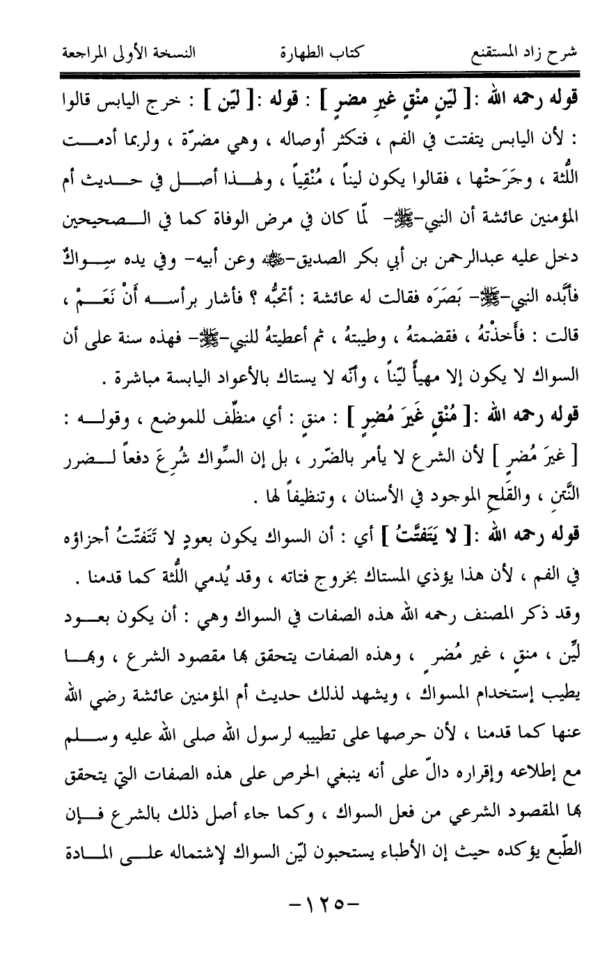 قوله رحمه الله: [ليّنٍ منْقٍ غيرِ مضرٍ]: قوله: [ليّن]: خرج اليابس قالوا: لأن اليابس يتفتت في الفم، فتكثر أوصاله، وهي مضرّة، ولربما أدمت اللُّثة، وجَرَحتْها، فقالوا يكون ليناً، مُنْقِياً، ولهذا أصل في حديث أم المؤمنين عائشة أن النبي -صَلَّى اللَّهُ عَلَيْهِ وَسَلَّمَ- لمّا كان في مرض الوفاة كما في الصحيحين دخل عليه عبد الرحمن بن أبي بكر الصديق -رضي الله عنه وعن أبيه- وفي يده سِواكٌ فأبَّده النبي -صَلَّى اللَّهُ عَلَيْهِ وَسَلَّمَ- بَصرَه فقالت له عائشة: أتحبُّه؟ فأشار برأسه أَنْ نَعَمْ، قالت: فأَخذْتهُ، فقضمتهُ، وطيبتهُ، ثم أعطيتهُ للنبي -صَلَّى اللَّهُ عَلَيْهِ وَسَلَّمَ- فهذه سنة على أن السواك لا يكون إلا مهيأً ليّناً، وأنه لا يستاك بالأعواد اليابسة مباشرة.