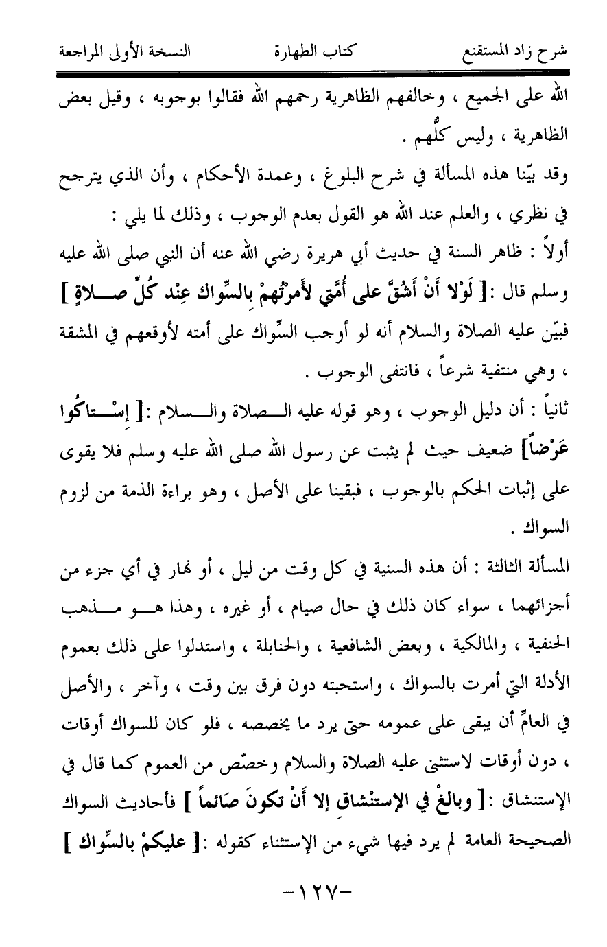 ثانياً: أن دليل الوجوب، وهو قوله عليه الصلاة والسلام: [إِسْتاكُوا عَرْضاً] ضعيف حيث لم يثبت عن رسول الله صَلَّى اللَّهُ عَلَيْهِ وَسَلَّمَ فلا يقوى على إثبات الحكم بالوجوب، فبقينا على الأصل، وهو براءة الذمة من لزوم السواك.
