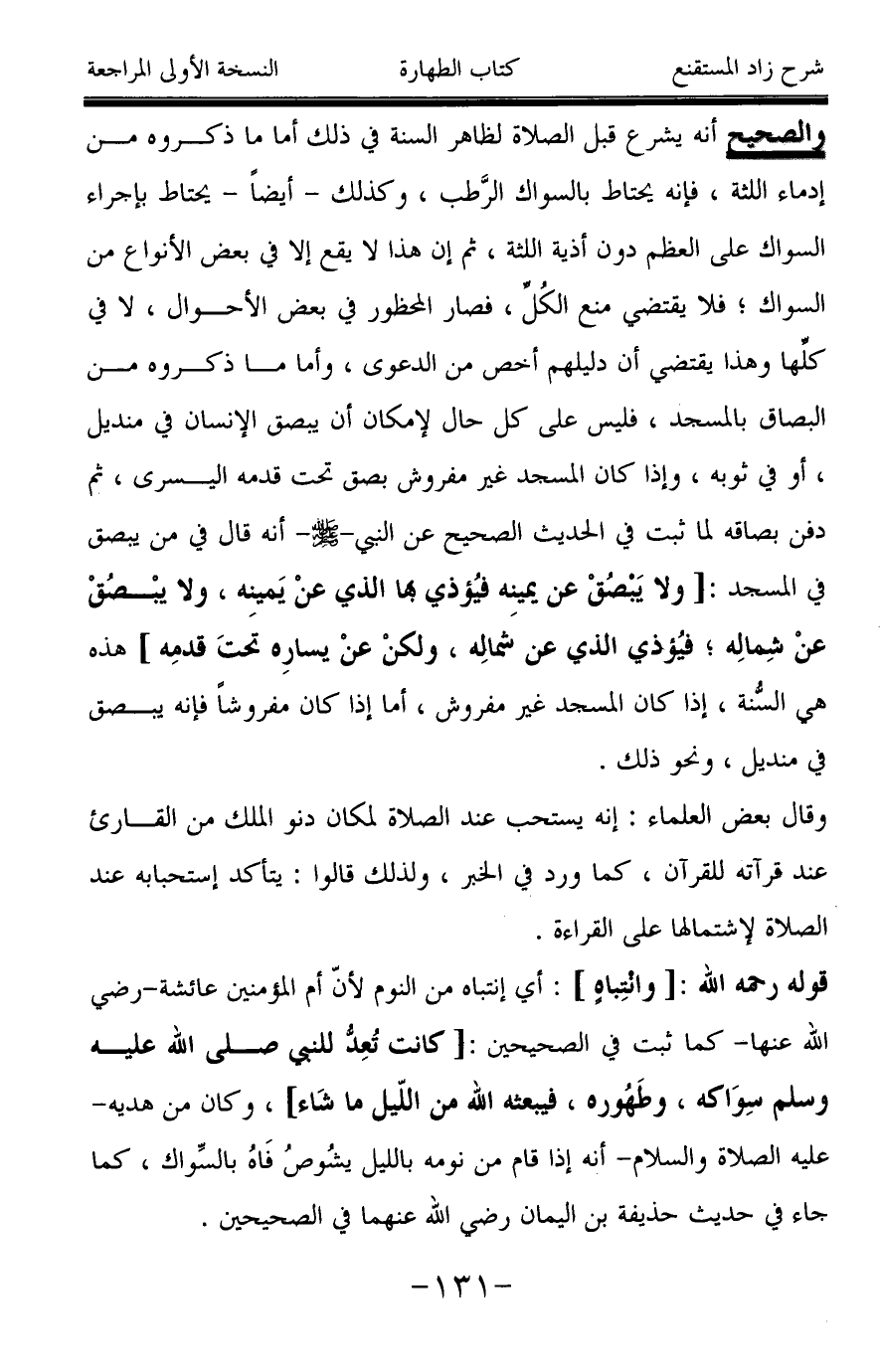 والصحيح أنه يشرع قبل الصلاة لظاهر السنة في ذلك أما ما ذكروه من إدماء اللثة، فإنه يحتاط بالسواك الرَّطب، وكذلك -أيضاً- يحتاط بإجراء السواك على العظم دون أذية اللثة، ثم إن هذا لا يقع إلا في بعض الأنواع من السواك؛ فلا يقتضي منع الكُلِّ، فصار المحظور في بعض الأحوال، لا في كلِّها وهذا يقتضي أن دليلهم أخص من الدعوى، وأما ما ذكروه من البصاق بالمسجد، فليس على كل حال لإمكان أن يبصق الإنسان في منديل، أو في ثوبه، وإذا كان المسجد غير مفروش بصق تحت قدمه اليسرى، ثم دفن بصاقه لما ثبت في الحديث الصحيح عن النبي -صَلَّى اللَّهُ عَلَيْهِ وَسَلَّمَ- أنه قال في من يبصق في السجد: [ولا يَبْصُقْ عن يمينِه فيُؤذي بها الذي عنْ يَمينِه، ولا يبْصُقْ عنْ شِمالِه؛ فيُؤذي الذي عن شمالِه، ولكنْ عنْ يسارِه تحتَ قدمِه] هذه هي السُّنة، إذا كان المسجد غير مفروش، أما إذا كان مفروشاً فإنه يبصق في منديل، ونحو ذلك.