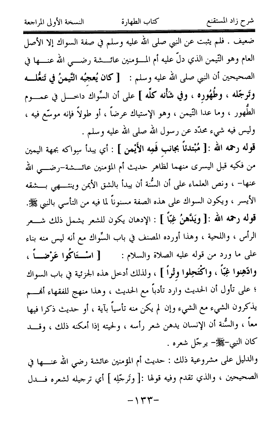 قوله رحمه الله: [ويَدَّهنُ غِبّاً]: الإدهان يكون للشعر يشمل ذلك شعر الرأس، واللحية، وهذا أورده المصنف في باب السِّواك مع أنه ليس منه بناء على ما ورد من قوله عليه الصلاة والسلام: [اسْتَاكُوا عَرْضاً، وادهِنوا غِبّاً، واكْتَحِلوا وِتْراً]، ولذلك أدخل هذه الجزئية في باب السواك؛ على تأول أن الحديث وارد تأدباً مع الحديث، وهذا منهج للفقهاء أنهم يذكرون الشيء مع الشيء وإن لم يكن منه تأسياً بآية، أو حديث ذكرا فيها معاً، والسُّنة أن الإنسان يدهن شعر رأسه، ولحيته إذا أمكنه ذلك، وقد كان النبي -صَلَّى اللَّهُ عَلَيْهِ وَسَلَّمَ- يرجّل شعره.