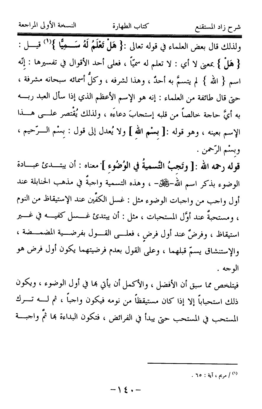 قوله رحمه الله: [وتَجب التَّسميةُ في الوُضُوءِ] معناه: أن يبتدئ عبادة الوضوء بذكر اسم الله -عز وجل-، وهذه التسمية واجبةٌ في مذهب الحنابلة عند أول واجب من واجبات الوضوء مثل: غسل الكفين عند الإستيقاظ من النوم، ومستحبةٌ عند أوَّل المستحبات، مثل: أن يبتدئ غسل كفيه في غير استيقاظ، وفرضٌ عند أول فرضٍ، فعلى القول بفرضية المضمضة، والإستنشاق يسمّ قبلهما، وعلى القول بعدم فرضيتهما يكون أول فرض هو الوجه.