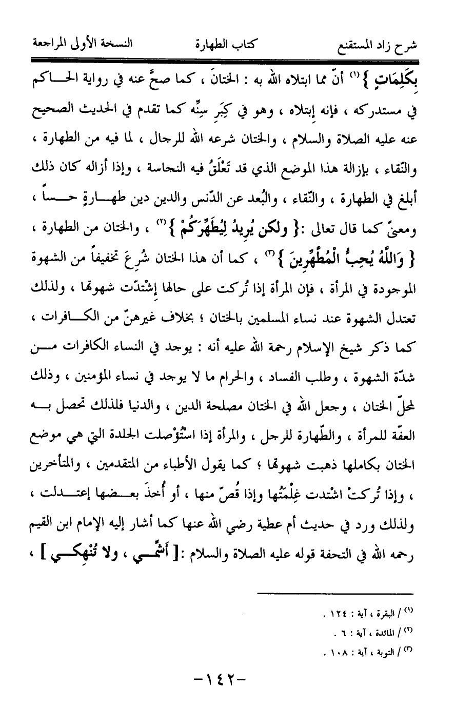 بِكَلِمَاتٍ} (¬1) أنّ مما ابتلاه الله به: الختانَ، كما صح عنه في رواية الحاكم في مستدركه، فإنه إِبتلاه، وهو في كِبَرِ سِنِّه كما تقدم في الحديث الصحيح عنه عليه الصلاة والسلام، والختان شرعه الله للرجال، لما فيه من الطهارة، والنّقاء، بإزالة هذا الموضع الذي قد تَعْلَقُ فيه النجاسة، وإذا أزاله كان ذلك أبلغ في الطهارة، والنّقاء، والبُعد عن الدّنس والدين دين طهارة حساً، ومعنى كما قال تعالى: {وَلَكِنْ يُرِيدُ لِيُطَهِّرَكُمْ} (¬2)، والختان من الطهارة، {وَاللَّهُ يُحِبُّ الْمُطَّهِّرِينَ} (¬3)، كما أن هذا الختان شُرِعَ تخفيفاً من الشهوة الموجودة في المرأة، فإن المرأة إذا تُركت على حالها إِشْتدّت شهوتها، ولذلك تعتدل الشهوة عند نساء المسلمين بالختان؛ بخلاف غيرهنّ من الكافرات، كما ذكر شيخ الإسلام رحمة الله عليه أنه: يوجد في النساء الكافرات من شدّة الشهوة، وطلب الفساد، والحرام ما لا يوجد في نساء المؤمنين، وذلك لمحل الختان، وجعل الله في الختان مصلحة الدين، والدنيا فلذلك تحصل به العفّة للمرأة، والطّهارة للرجل، والمرأة إذا استؤْصلت الجلدة التي هي موضع الختان بكاملها ذهبت شهوتها؛ كما يقول الأطباء من المتقدمين، والمتأخرين، وإذا تُركتْ اشْتدت غِلْمَتُها وإذا قُصّ منها، أو أخذَ بعضها إعتدلت، ولذلك ورد في حديث أم عطية رضي الله عنها كما أشار إليه الإمام ابن القيم رحمه الله في التحفة قوله عليه الصلاة والسلام: [أشمِّي، ولا تُنْهِكي]،