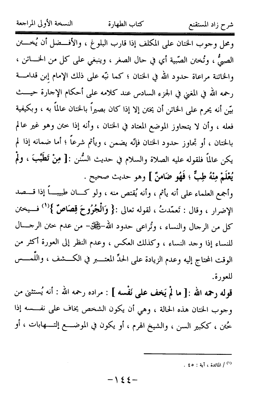 وأجمع العلماء على أنه يأثم، وأنه يُقتص منه، ولو كان طبيباً إذا قصد الإضرار، وقال: تَعمّدتُ، لقوله تعالى: {وَالْجُرُوحَ قِصَاصٌ} (¬1) فيختن كل من الرجال والنساء، وتُراعى حدود الله -عز وجل- من عدم ختن الرجال للنساء إذا وجد النساء، وكذلك العكس، وعدم النظر إلى العورة أكثر من الوقت المحتاج إليه وعدم الزيادة على الحدِّ المعتبر في الكشف، واللَّمس للعورة.