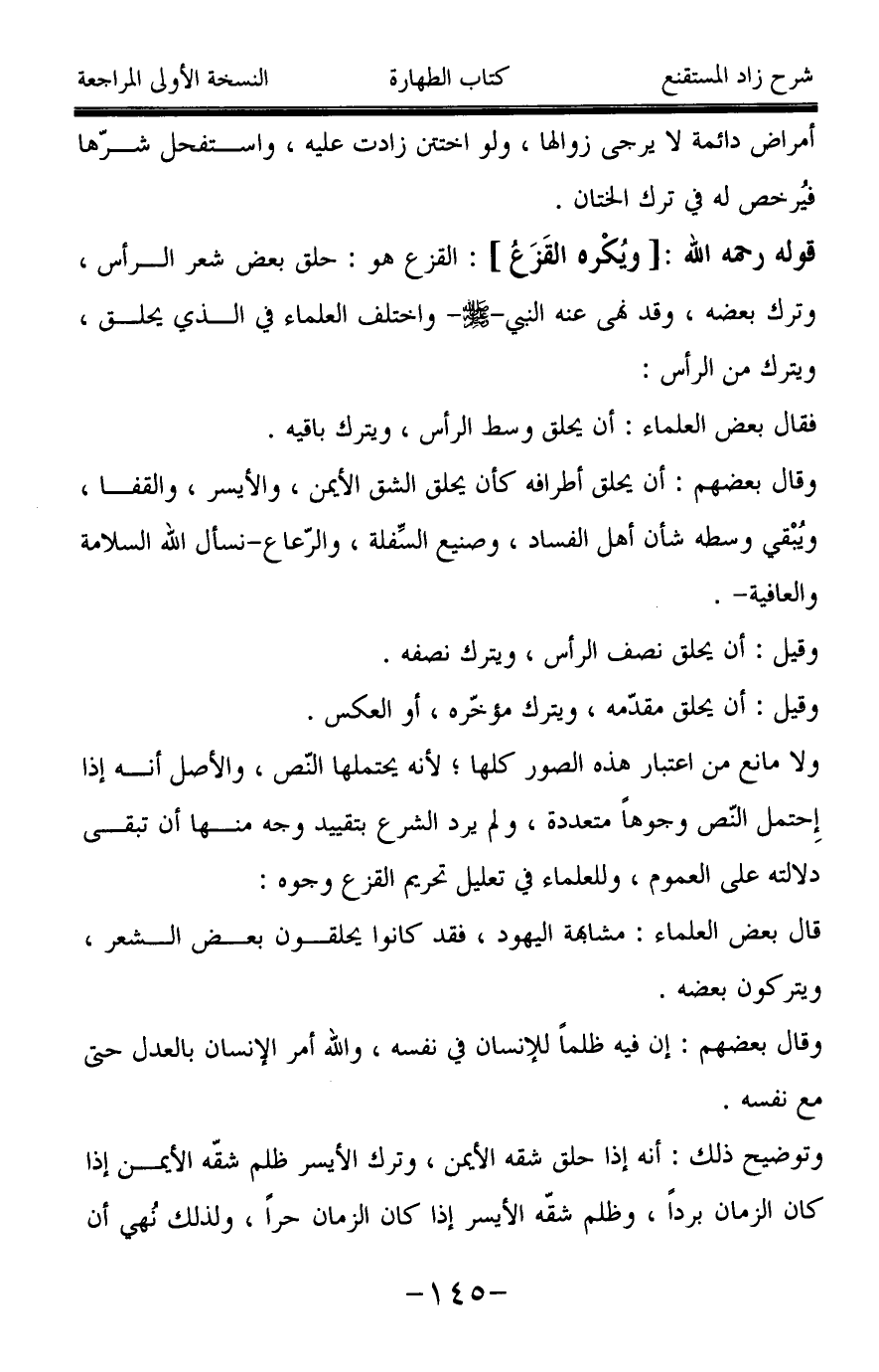 وتوضيح ذلك: أنه إذا حلق شقه الأيمن، وترك الأيسر ظلم شقّه الأيمن إذا كان الزمان برداً، وظلم شقّه الأيسر إذا كان الزمان حراً، ولذلك نُهي أن