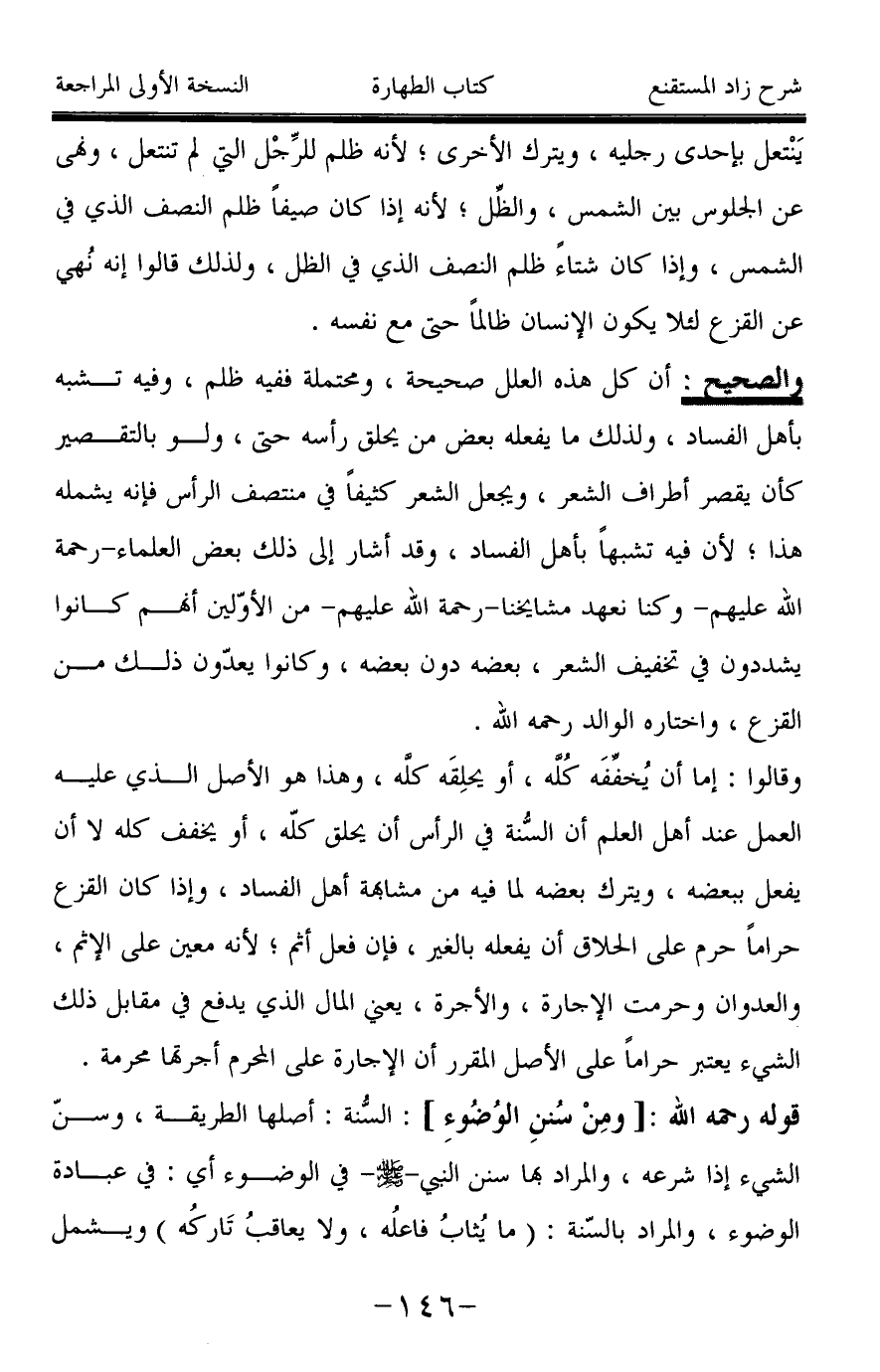 يَنْتعل بإحدى رجليه، ويترك الأخرى؛ لأنه ظلم للرِّجْل التي لم تنتعل، ونهى عن الجلوس بين الشمس، والظِّل؛ لأنه إذا كان صيفاً ظلم النصف الذي في الشمس، وإذا كان شتاءً ظلم النصف الذي في الظل، ولذلك قالوا إنه نُهي عن القزع لئلا يكون الإنسان ظالماً حتى مع نفسه.