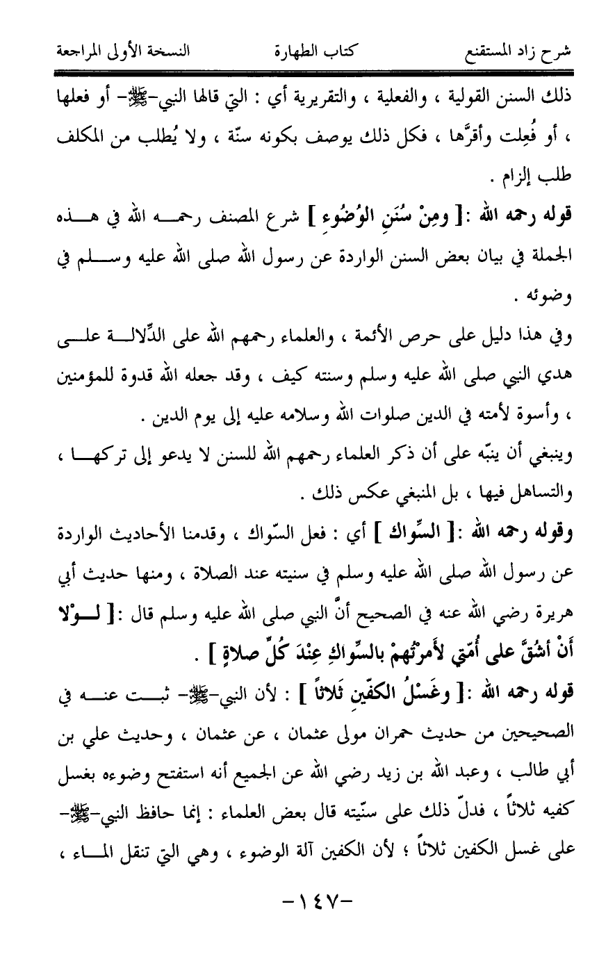 قوله رحمه الله: [وغَسْلُ الكفينِ ثَلاثاً]: لأن النبي -صَلَّى اللَّهُ عَلَيْهِ وَسَلَّمَ- ثبت عنه في الصحيحين من حديث حمران مولى عثمان، عن عثمان، وحديث علي بن أبي طالب، وعبد الله بن زيد رضي الله عن الجميع أنه استفتح وضوءه بغسل كفيه ثلاثاً، فدلّ ذلك على سنّيته قال بعض العلماء: إنما حافظ النبي -صَلَّى اللَّهُ عَلَيْهِ وَسَلَّمَ- على غسل الكفين ثلاثاً؛ لأن الكفين آلة الوضوء، وهي التي تنقل الماء،