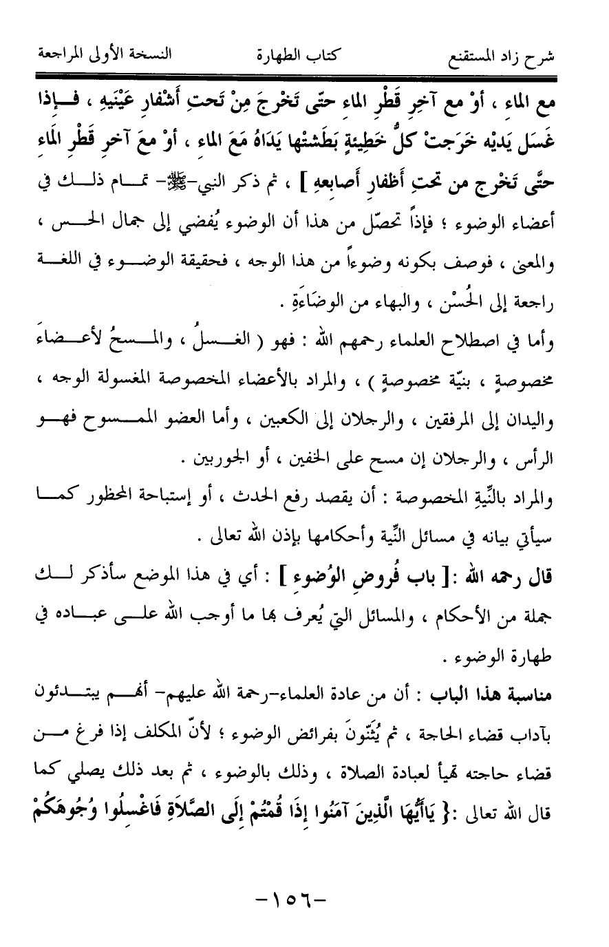 مناسبة هذا الباب: أن من عادة العلماء -رحمة الله عليهم- أنهم يبتدئون بآداب قضاء الحاجة، ثم يُثَنّونَ بفرائض الوضوء، لأنّ المكلف إذا فرغ من قضاء حاجته تهيأ لعبادة الصلاة، وذلك بالوضوء، ثم بعد ذلك يصلي كما قال الله تعالى: {يَا أَيُّهَا الَّذِينَ آمَنُوا إِذَا قُمْتُمْ إِلَى الصَّلَاةِ فَاغْسِلُوا وُجُوهَكُمْ