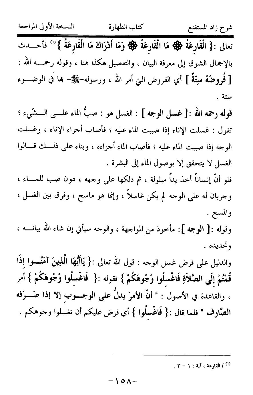 تعالى: {الْقَارِعَةُ * مَا الْقَارِعَةُ * وَمَا أَدْرَاكَ مَا الْقَارِعَةُ} (¬1) فأحدث بالإجمال الشوق إلى معرفة البيان، والتفصيل هكذا هنا، وقوله رحمه الله: [فروضُهُ ستّة] أي الفروض التي أمر الله، ورسوله -صَلَّى اللَّهُ عَلَيْهِ وَسَلَّمَ- بها في الوضوء ستة.