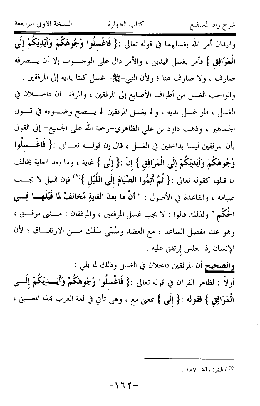 والواجب الغسل من أطراف الأصابع إلى المرفقين، والمرفقان داخلان في الغسل، فلو غسل يديه، ولم يغسل المرفقين لم يصح وضوءه في قول الجماهير، وذهب داود بن علي الظاهري -رحمة الله على الجميع- إلى القول بأن المرفقين ليسا بداخلين في الغسل، قال إن قوله تعالى: {فَاغْسِلُوا وُجُوهَكُمْ وَأَيْدِيَكُمْ إِلَى الْمَرَافِقِ} إِنّ: {إِلَى} غاية، وما بعد الغاية يخالف ما قبلها كقوله تعالى: {ثُمَّ أَتِمُّوا الصِّيَامَ إِلَى اللَّيْلِ} (¬1) فإن الليل لا يجب صيامه، والقاعدة في الأصول: " أن ما بعدَ الغايةِ مُخالفٌ لما قَبْلَها فِي الحُكْمِ " ولذلك قالوا: لا يجب غسل المرفقين، والمرفقان: مثنى مرفق، وهو عند مفصل الساعد، مع العضد وسُمّي بذلك من الارتفاق، لأن الإنسان إذا جلس إِرتفق عليه.