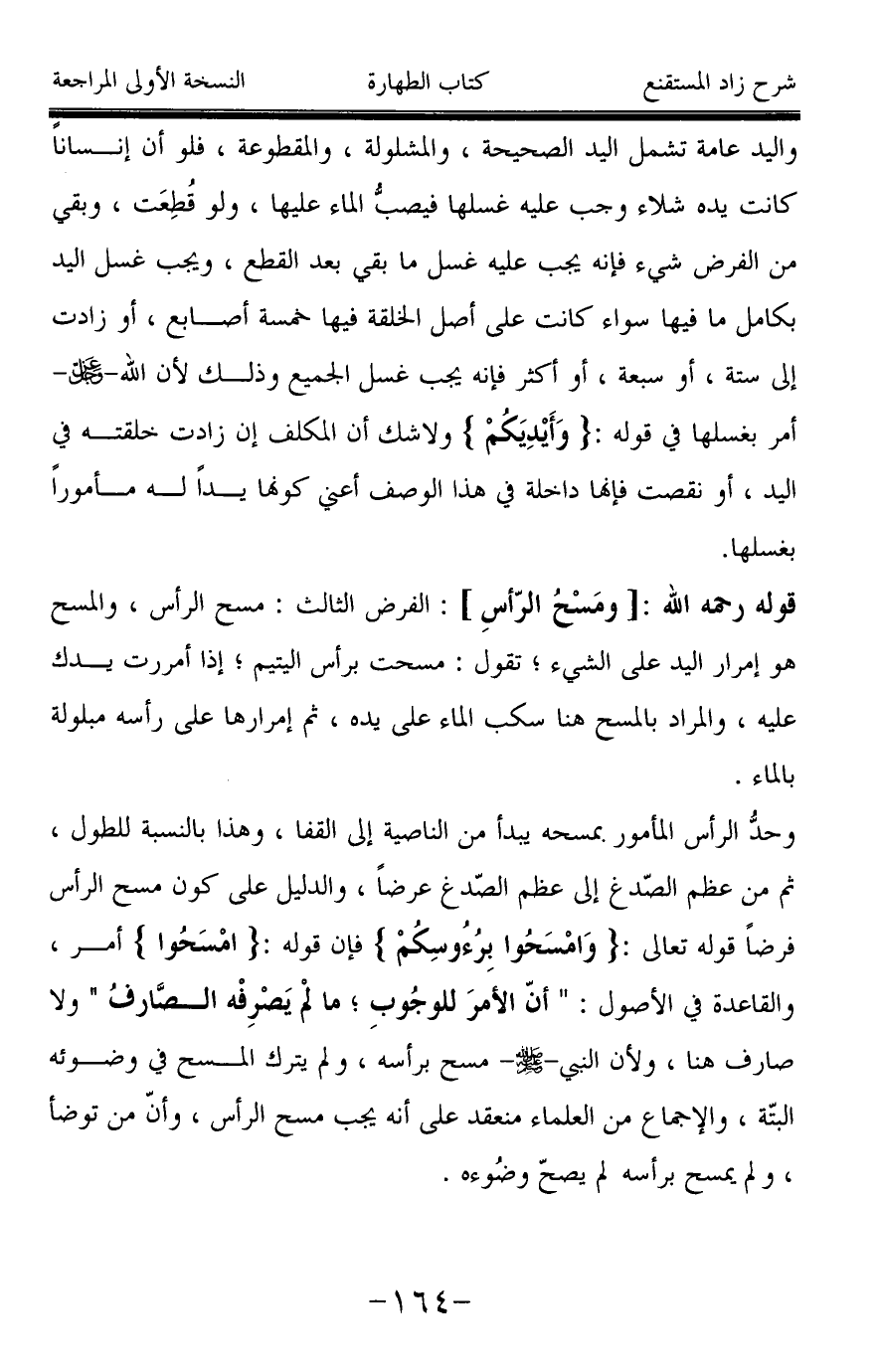 وحدُّ الرأس المأمور بمسحه يبدأ من الناصية إلى القفا، وهذا بالنسبة للطول، ثم من عظم الصّدغ إلى عظم الصّدغ عرضاً، والدليل على كون مسح الرأس فرضاً قوله تعالى: {وَامْسَحُوا بِرُءُوسِكُمْ} فإن قوله: {امْسَحُوا} أمر، والقاعدة في الأصول: " أنّ الأمرَ للوجُوبِ؛ ما لمْ يَصْرِفْه الصَّارفُ " ولا صارف هنا، ولأن النبي -صَلَّى اللَّهُ عَلَيْهِ وَسَلَّمَ- مسح برأسه، ولم يترك المسح في وضوئه البتّة، والإجماع من العلماء منعقد على أنه يجب مسح الرأس، وأنّ من توضأ، ولم يمسح برأسه لم يصحّ وضُوءه.