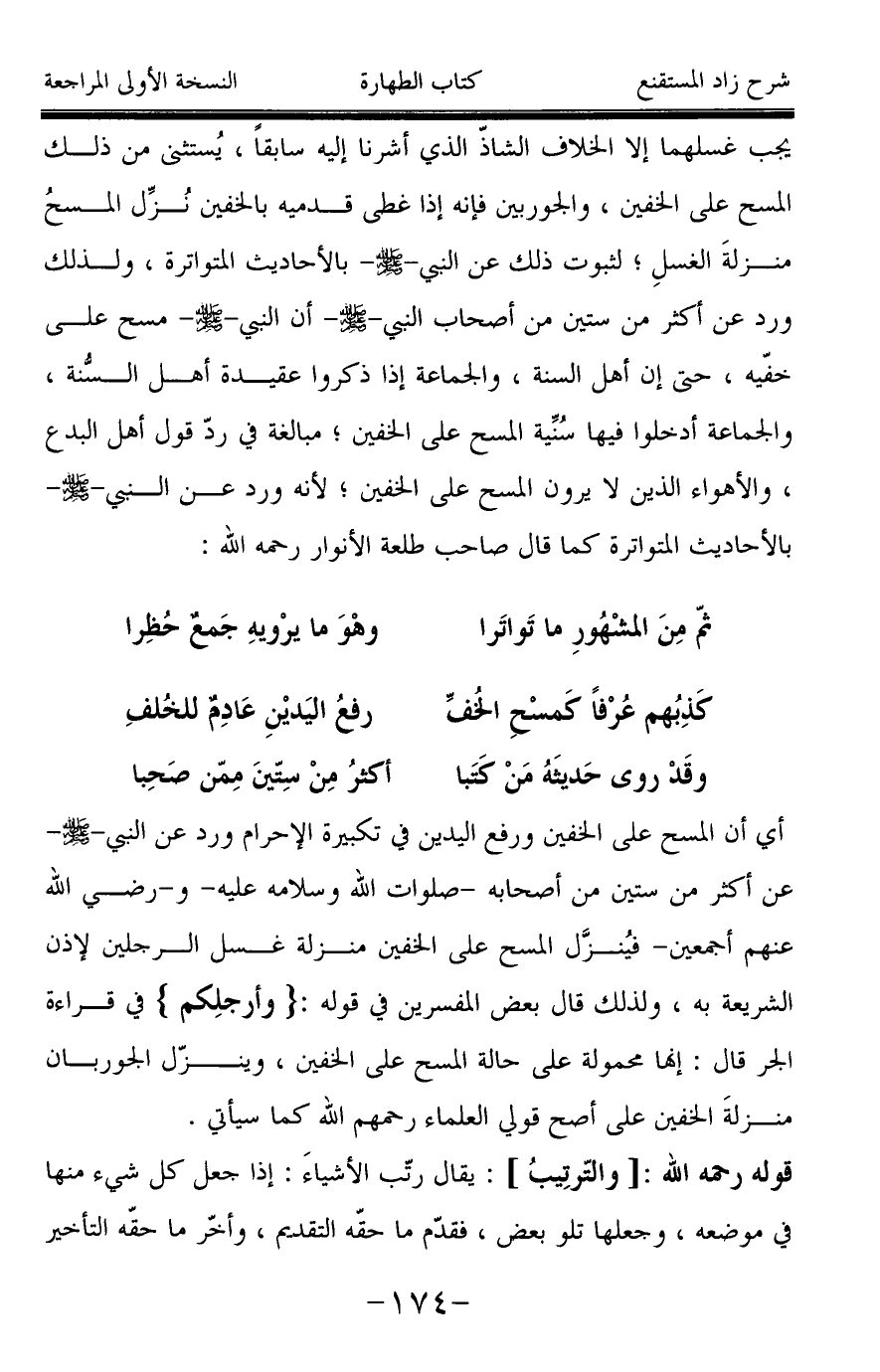 أي أن المسح على الخفين ورفع اليدين في تكبيرة الإحرام ورد عن النبي -صَلَّى اللَّهُ عَلَيْهِ وَسَلَّمَ- عن أكثر من ستين من أصحابه -صلوات الله وسلامه عليه- و -رضي الله عنهم أجمعين- فيُنزَّل المسح على الخفين منزلة غسل الرجلين لإذن الشريعة به، ولذلك قال بعض المفسرين في قوله: {وَأَرْجُلَكُمْ} في قراءة الجر قال: إنها محمولة على حالة المسح على الخفين، وينزّل الجوربان منزلةَ الخفين على أصح قولي العلماء رحمهم الله كما سيأتي.